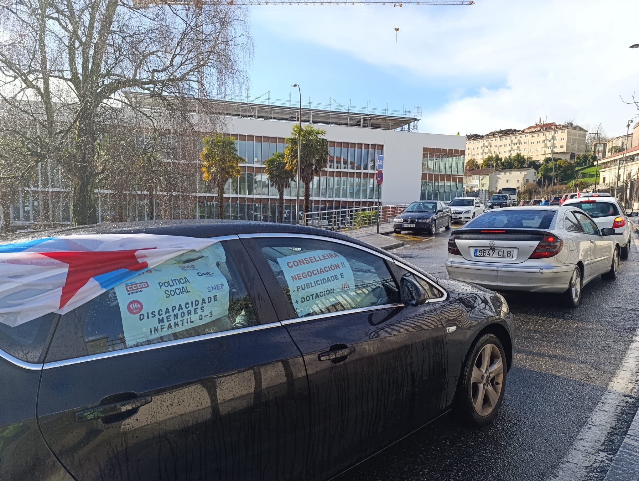 Persoal dos sectores de coidado de menores, atención á discapacidade e educación infantil 0-3 en centros de xestión privada e representantes sindicais protagonizaron este mércores unha caravana de vehículos arredor do edificio da Xunta en San Caetano para reclamar condicións laborais e salariais dignas.