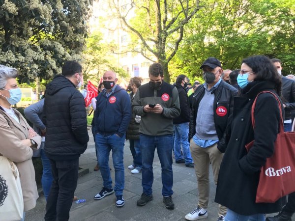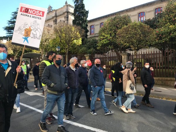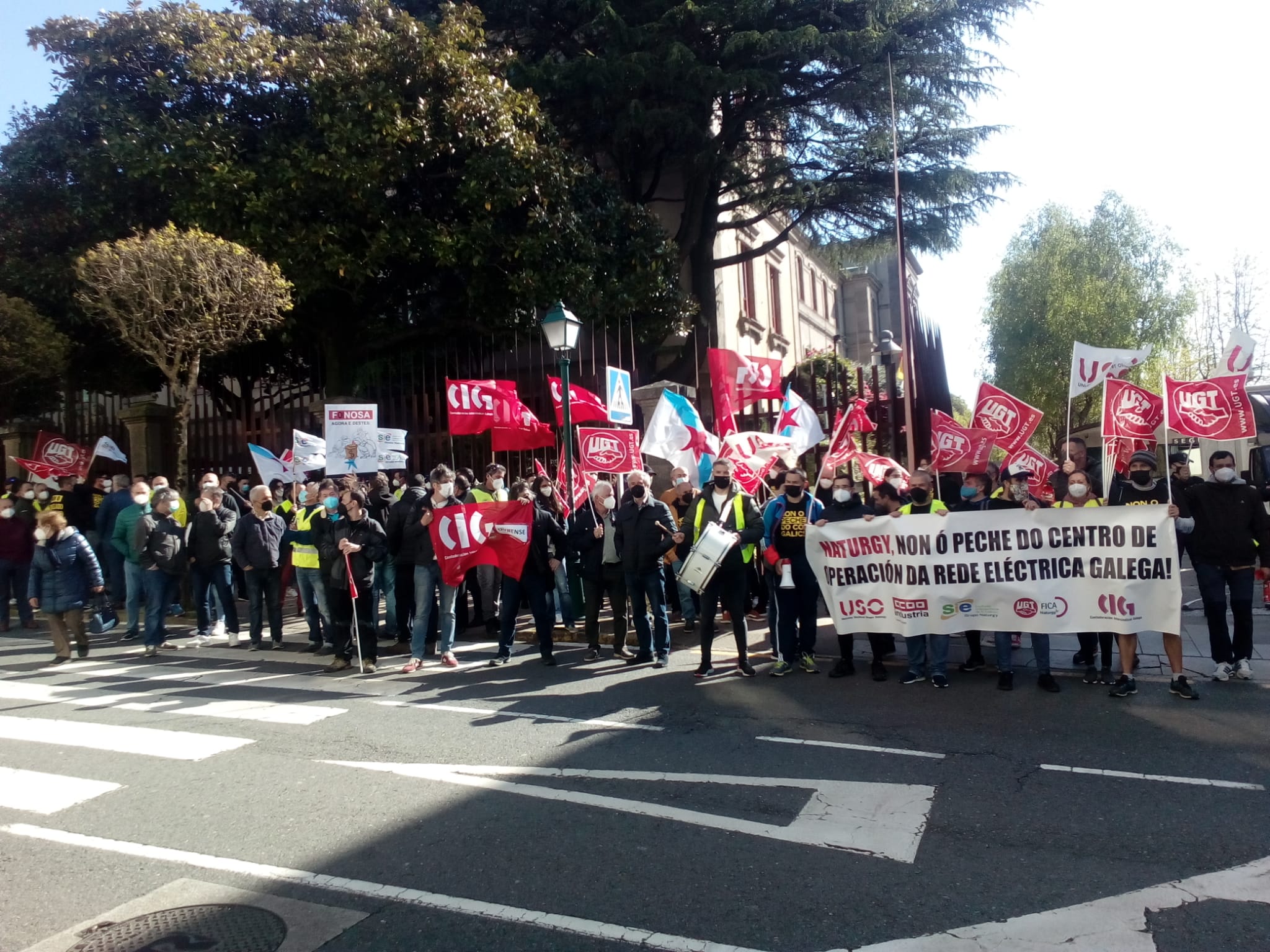 Traballadores e traballadoras de Naturgy manifestáronse esta mañá polas rúas de Compostela e concentráronse diante do Parlamento de Galiza, coincidindo coa xuntanza da comisión parlamentar de Industria, Enerxía, Comercio e Turismo na que o BNG demandou unha aclaración respecto das actuacións que vai levar a cabo a Xunta de Galiza para frear a deslocalización dos servizos das empresas eléctricas en xeral, e en particular dos servizos de Naturgy na Coruña.