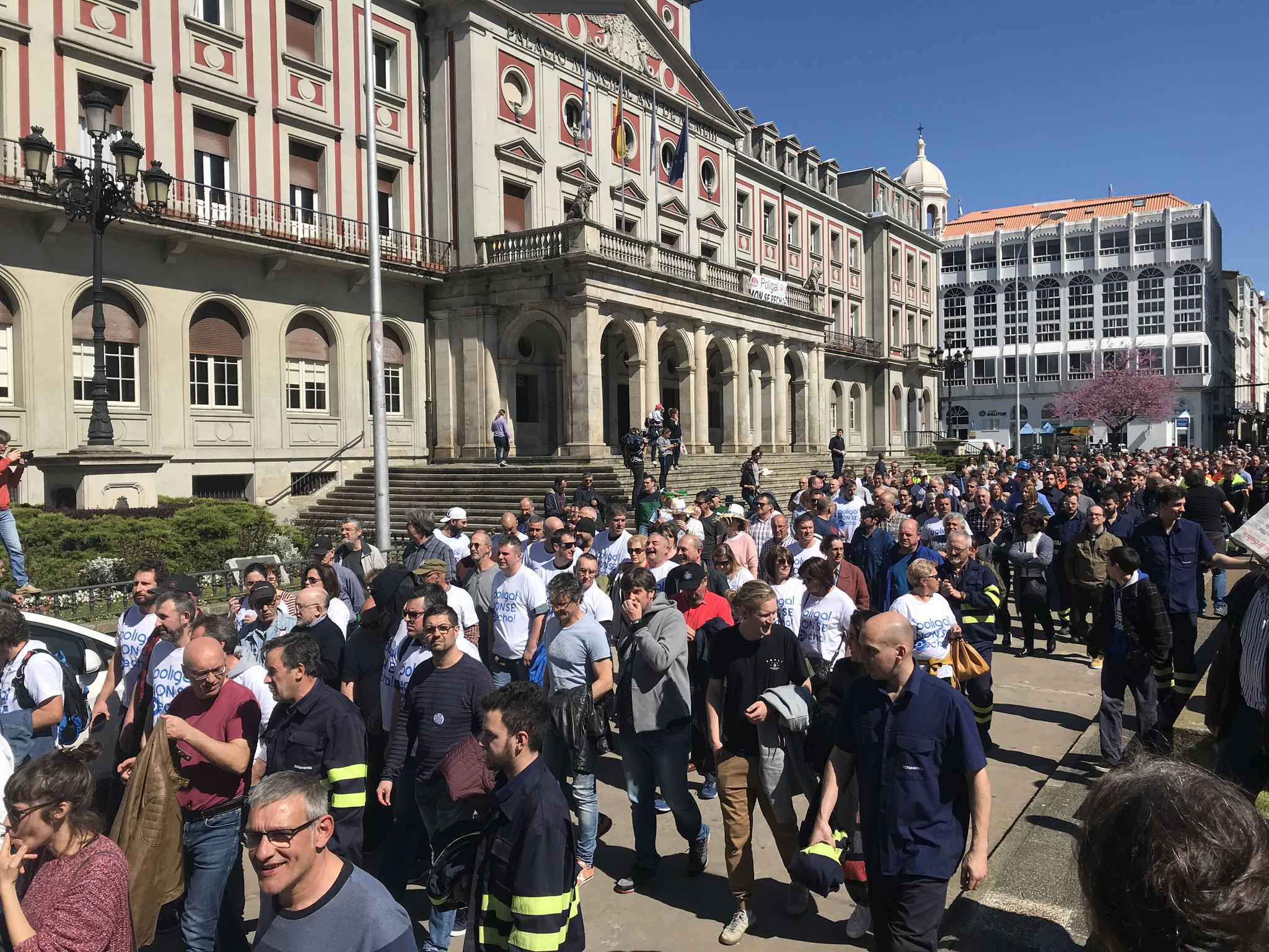 Bernardo Cabezal, delegado da CIG no comité de Poligal, explicaba que se tomou a decisión de facer o peche durante un día no Concello de Ferrol por ser a cabeceira da comarca e logo saír en manifestación para reivindicar alternativas que garantan a continuidade dos postos de traballo e da produción.