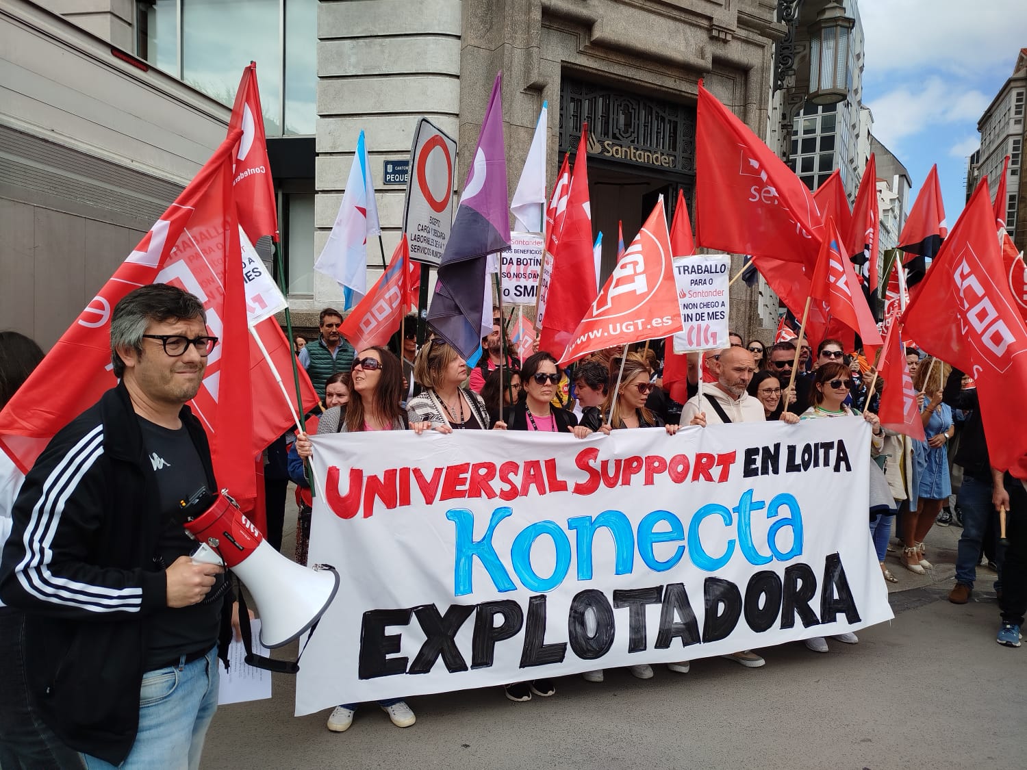 Traballadores e traballadoras de Universal Support concentráronse este mércores diante da oficina do Banco Santander no Cantón Grande (antiga sede do Banco Pastor) en demanda dunha melloras das condicións laborais na campaña Superliña. O comité leva meses reclamándolle á empresa que sente negociar para abordar a desorganización do traballo e a precarización laboral, mais sen recibir resposta.