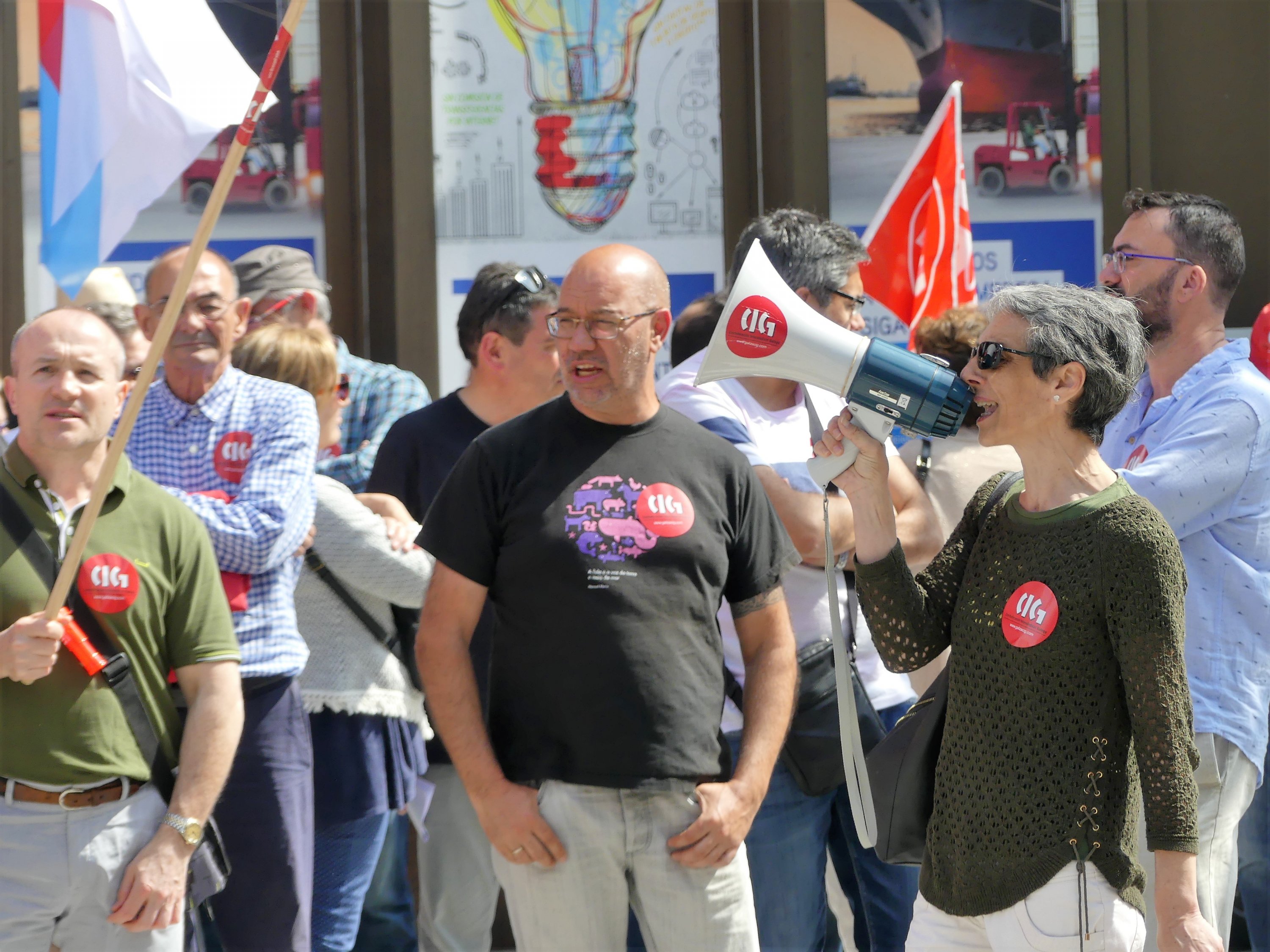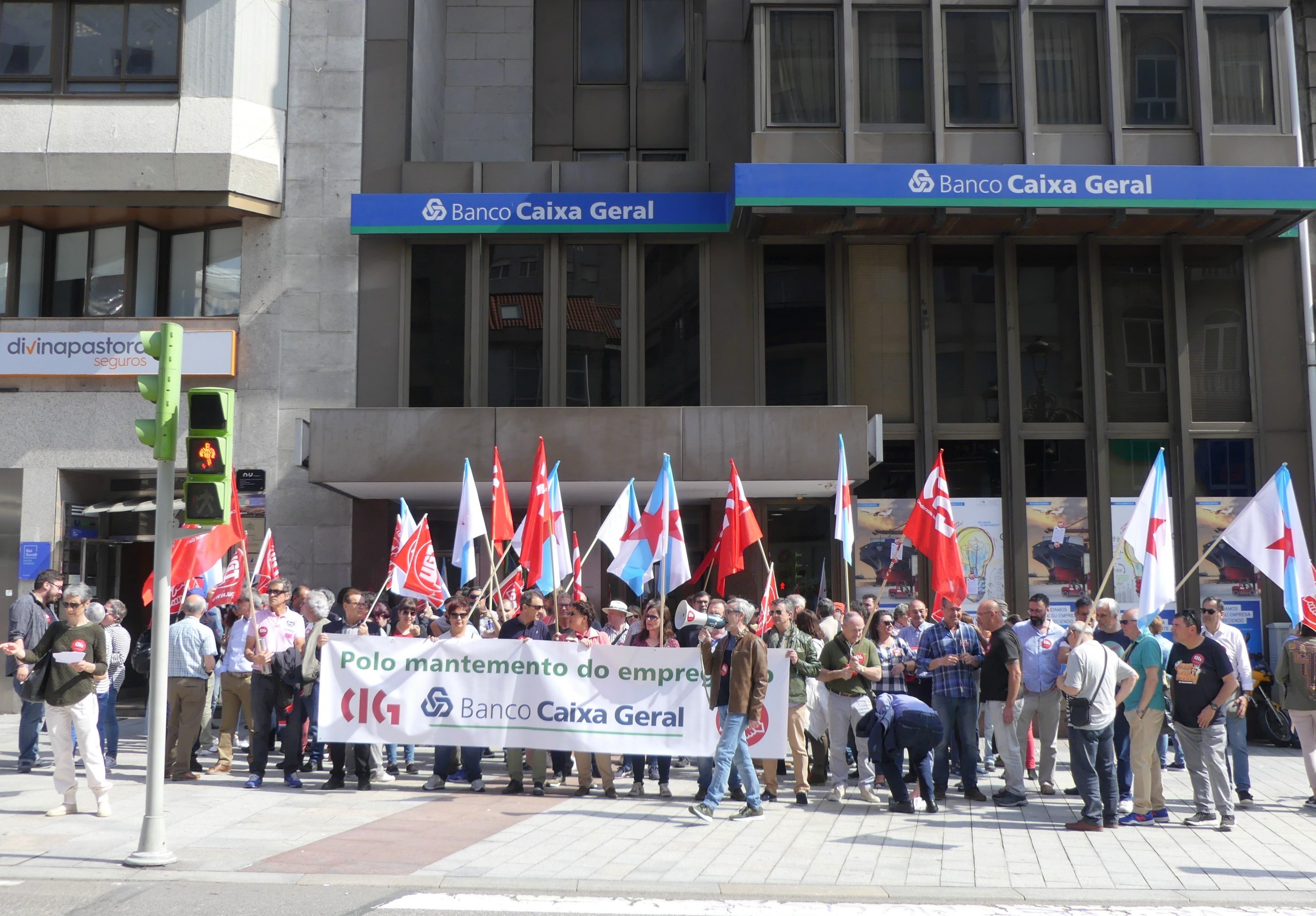Empregados/as do Banco Caixa Geral e delegados/as sindicais da CIG e UGT desenvolveron hoxe unha mobilización ás portas dunha sucursal en Vigo para reclamar o mantemento de todos os postos de traballo e esixir información a respecto do proceso de venda no que está inmersa a entidade.
