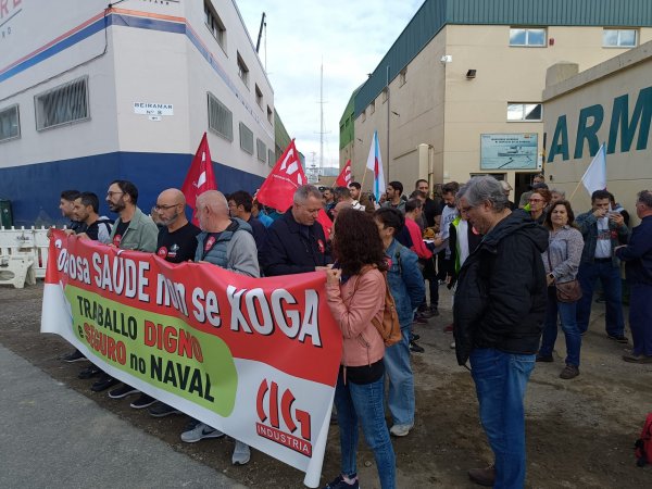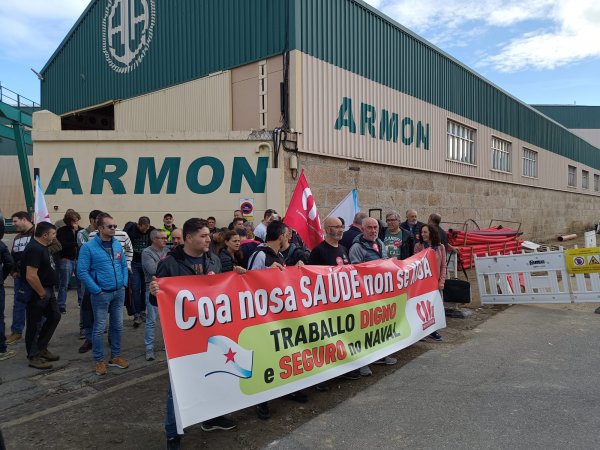 Traballadores/as do sector naval vigués desenvolveron hoxe unha concentración diante das instalacións do Grupo Armón, que integra as empresas Armón Vigo e Astilleros Ría de Vigo (antiga Barreras), para reclamar unhas condicións dignas e maior seguridade no estaleiro.