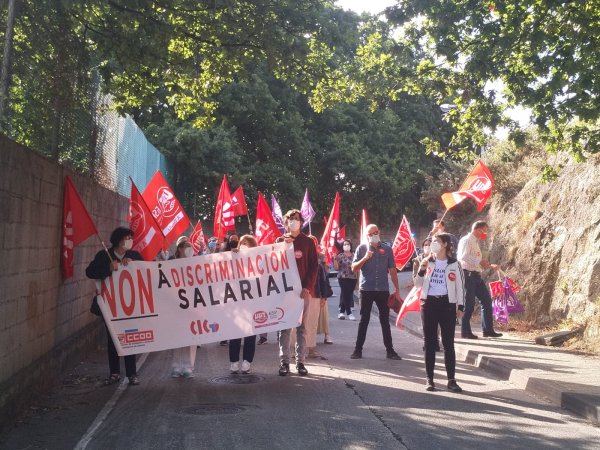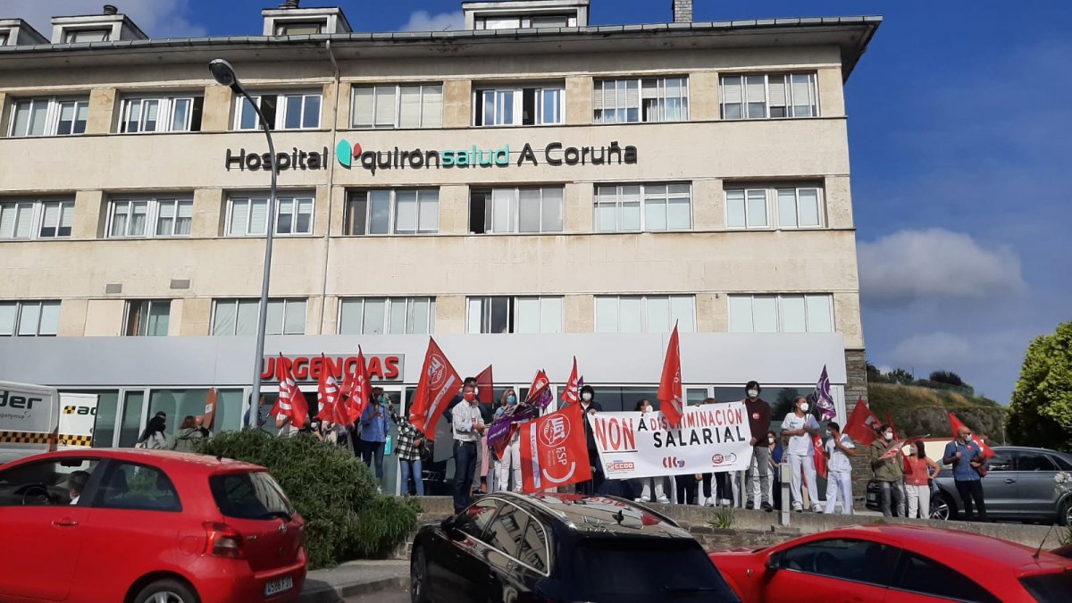Traballadoras e traballadores do Hospital Quirónsalud (Santa Teresa) da Coruña realizaron este mércores unha manifestación entre a entre a porta principal de acceso ao hospital (na rúa Londres) e a entrada de urxencias (situada na rúa Ginebra), para esixir a fin das discriminacións salariais, unhas condicións de traballo dignas e que a empresa solucione, dunha vez, a sobrecarga de traballo que padece o persoal debido asistencial.