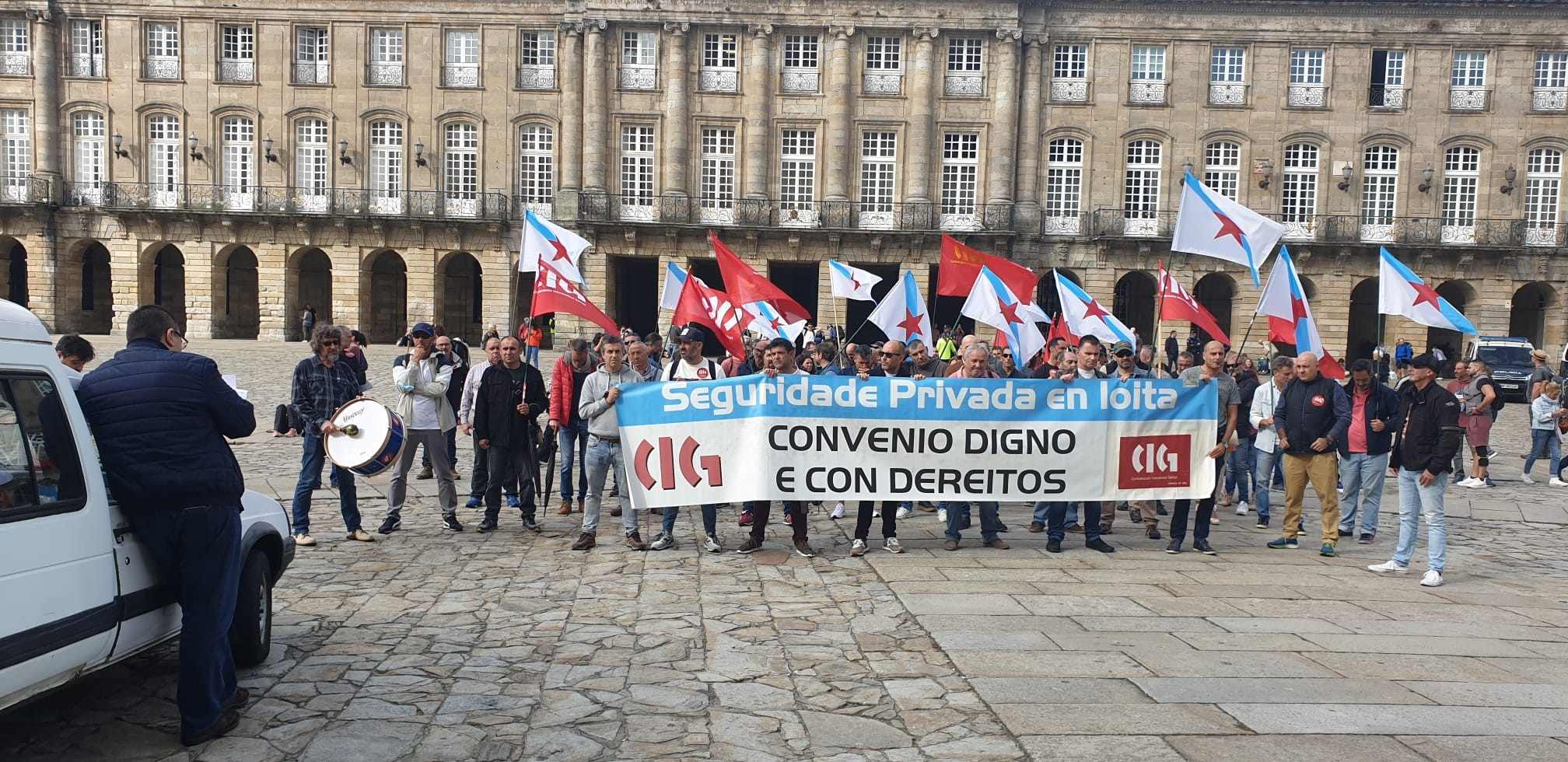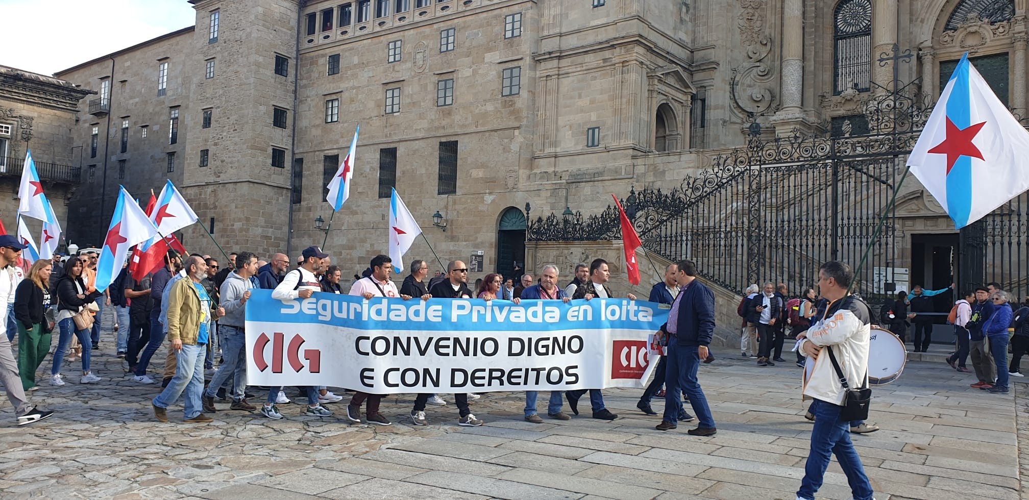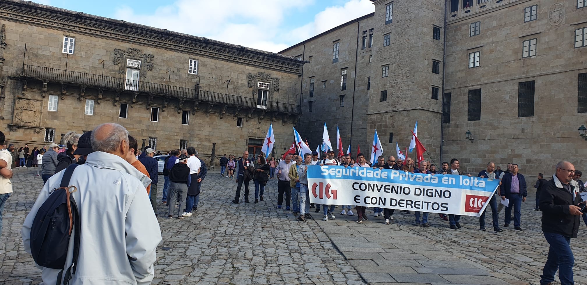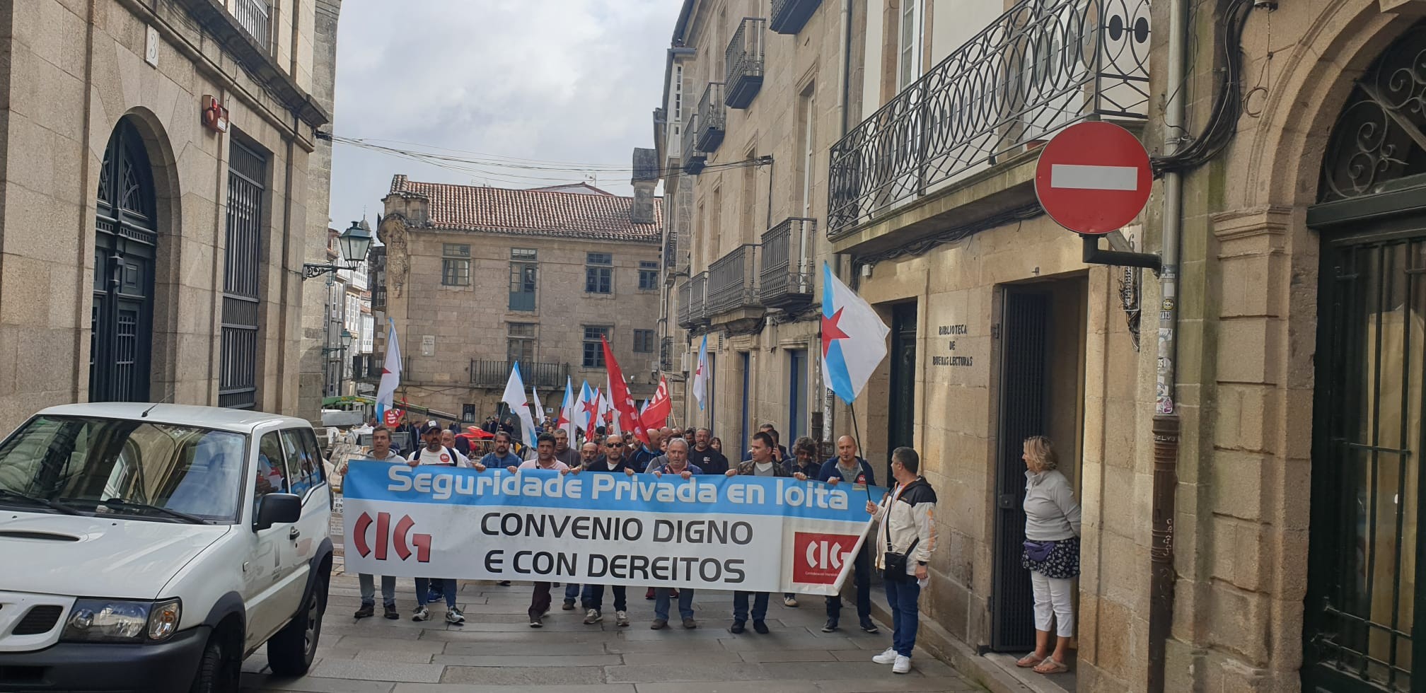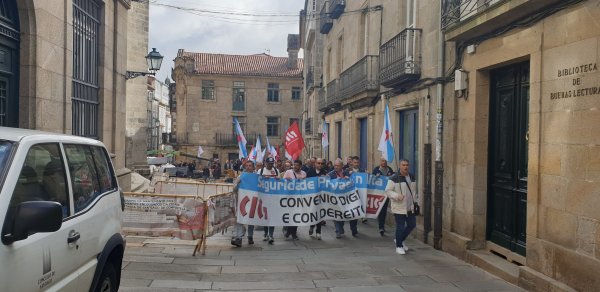 Traballadoras e traballadores do sector da Seguridade Privada concentrábase a primeira hora da mañá de hoxe diante do edificio administrativo da Xunta de Galiza en Santiago, porque é a administración que máis contratos licita coas empresas do sector. De seguido saíron en manifestación polas rúas do casco vello compostelán cara a Praza do Obradoiro. No seu percorrido lembraron a viva voz a unha das patronais, “APROSER, cobarde, a xente está que arde” e reclamaron un “convenio digno e con dereitos”.