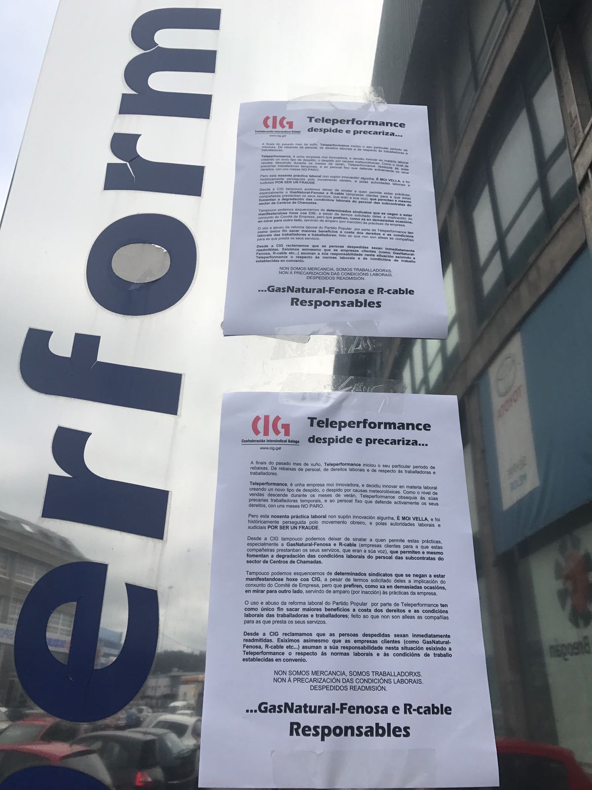 Por outra banda, a mobilización diante de Teleperformance -empresa de telemarketing que presta servizos para Gas Natutal-Fenosa, R Cable ou Iberdrola- é para rexeitar que o persoal eventual e con menos antigüidade é despedido “por razóns meteorolóxicas: no verán, cando baixan as vendas”.