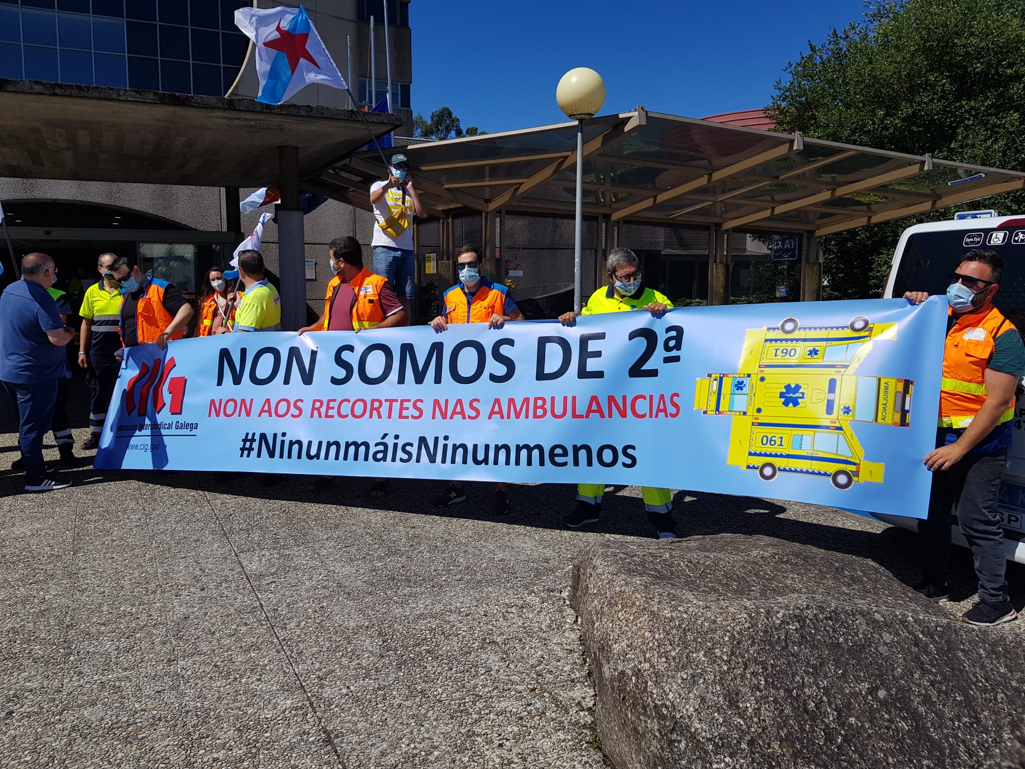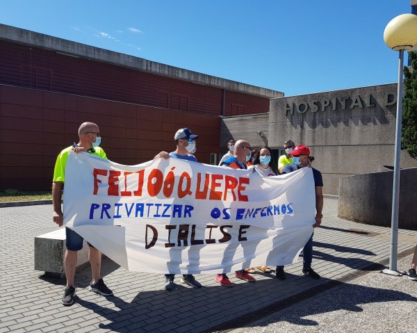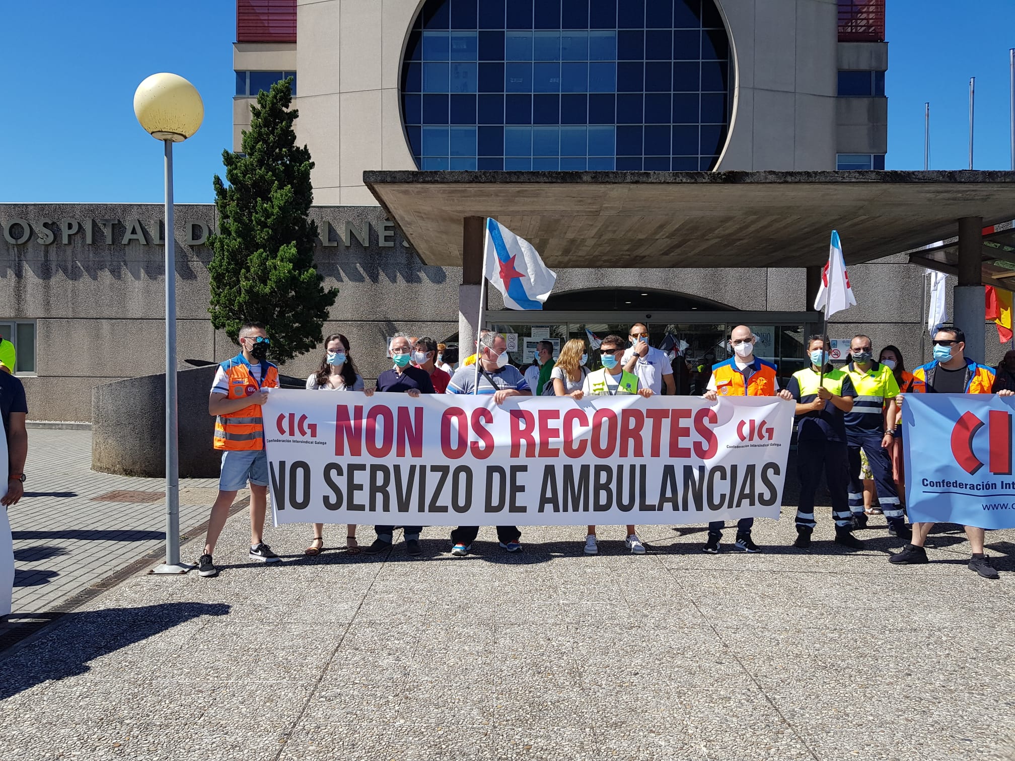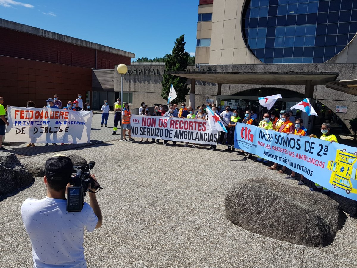 Persoal sanitario da comarca do Salnés mobilizouse hoxe diante do hospital comarcal convocado pola CIG para rexeitar a política de recortes e de privatizacións da Xunta. Na protesta participaron tamén traballadores/as do sector do transporte sanitario para denunciar a falta de técnicos/as nas ambulancias medicalizadas e a privatización do servizo de atención e traslado dos pacientes de diálise.