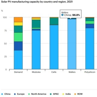 En canto á produción industrial do futuro -a produción ecolóxica-, China é o líder absoluto. En 2021 agregou máis capacidade eólica mariña que o resto do mundo no cinco anos anteriores xuntos. Na produción de paneis solares deixa moi atrás a todos os países (ver gráfico) e para 2030 o país producirá máis do dobre de baterías eléctricas que todos os demais países xuntos.