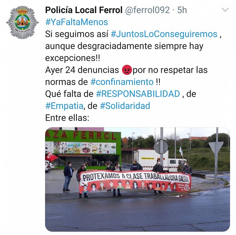 O pasado 28 de abril, con motivo do Día Mundial da Seguridade e a Saúde Laboral, a CIG realizou protestas simbólicas diante de centros de traballo e polígonos industriais para esixir medidas de protección para a clase traballadora. As accións realizáronse por pequenos grupos de 10 ou 12 persoas e respectando as correspondentes medidas de seguridade. O estado de alarma non suprime dereitos fundamentais como o de manifestación, mais a Policía Local de Ferrol, non só procedeu a identificar os compañeiros e compañeiras que participaron na protesta, senón que dende o seu perfil oficial en twitter acusaron a CIG de irresponsabilidade e falta de empatía, nunha actuación que "claramente extralimita as súas funcións".