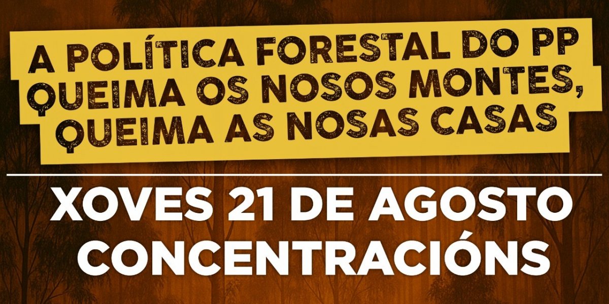 A plataforma ‘Por un monte Galego con Futuro’ convoca mobilizacións para denunciar que a actual vaga de incendios que está a padecer Galiza é consecuencia directa da política forestal do PP, unha política forestal que, tal e como recolle o lema escollido para as protestas, “queima os nosos montes e as nosas casas”. A CIG, que fai parte da plataforma e que tomou a iniciativa de impulsar a convocatoria, fai un chamamento a participar nas 26 concentracións que terán lugar este xoves 21 de agosto por todo o país a partir das 20:00 horas.