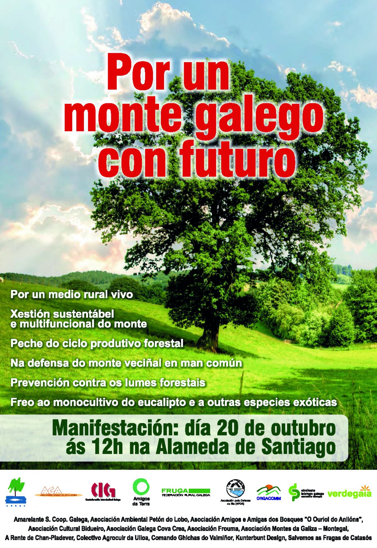 A plataforma ‘Por un monte galego con futuro’, da que fai parte a CIG, convoca unha manifestación nacional para o día 20 de outubro, con saída ás 12:00 horas da Alameda compostelá. A plataforma fai un chamamento á mobilización porque, no actual contexto de mudanza climática, o papel dos ecosistemas forestais vai resultar chave para mitigar os efectos do quecemento global, como reservas de carbono, mais tamén de ecosistemas que garantan o mantemento desa biodiversidade, a regulación do ciclo da auga, a fertilidade do solo, a capacidade de purificación da auga e do ar ou a loita contra a erosión.