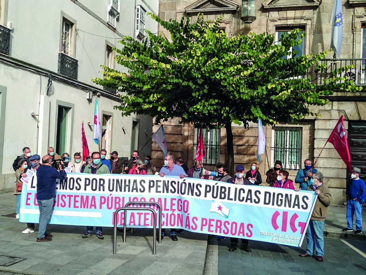 O colectivo de persoas xubiladas e pensionistas da CIG mobilizouse este xoves día 1 na Coruña, Ferrol, Lugo, Pontevedra, Santiago e Vigo na defensa dunhas pensións públicas dignas e garantidas e para esixir un sistema público galego de atención ás persoas. As protestas, realizadas diante de edificios administrativos do Goberno español e da Xunta de Galiza, repetiranse con carácter mensual até finais de ano.