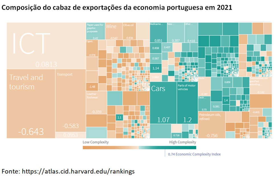 O desempenho negativo do investimento e da produtividade na década que se seguiu ao programa de ajustamento reflete-se na estrutura produtiva do país. É isso que se percebe quando olhamos para o cabaz de exportações português: o país especializou-se na produção e exportação de bens e serviços pouco sofisticados e de baixo valor acrescentado (assinalados no gráfico ao lado a castanho mais escuro), com destaque para o turismo, o setor que mais cresceu e que tem concentrado boa parte do investimento nos últimos anos.