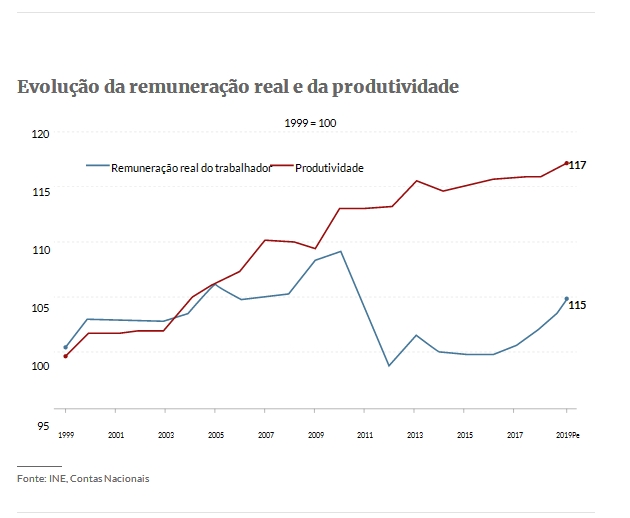 Com a desfaçatez de quem muito explora, avançam ainda que os salários, e em particular o SMN, devem evoluir segundo critérios em que se incluem a produtividade e a inflação… Pois bem, se houvesse coerência, não poderia haver objecções à fixação do SMN nos 1137 euros em 2020, valor que resulta da aplicação da evolução dos preços e da produtividade ao SMN conquistado com a revolução de Abril de 1974. Mas não há coerência porque tais critérios são manipulados ou ignorados para beneficiar os interesses do capital. Só nas duas últimas décadas, a diferença entre a tal produtividade e a evolução dos salários é a que se segue, conforme mostram as contas nacionais.