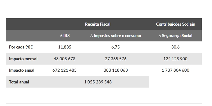 Estimámos o impacto por cada incremento de 90 euros por mês, em média, para cada assalariado. Ao nível do IRS e dos impostos ao consumo, a receita fiscal anual poderá aumentar mais de mil milhões de euros ao ano.