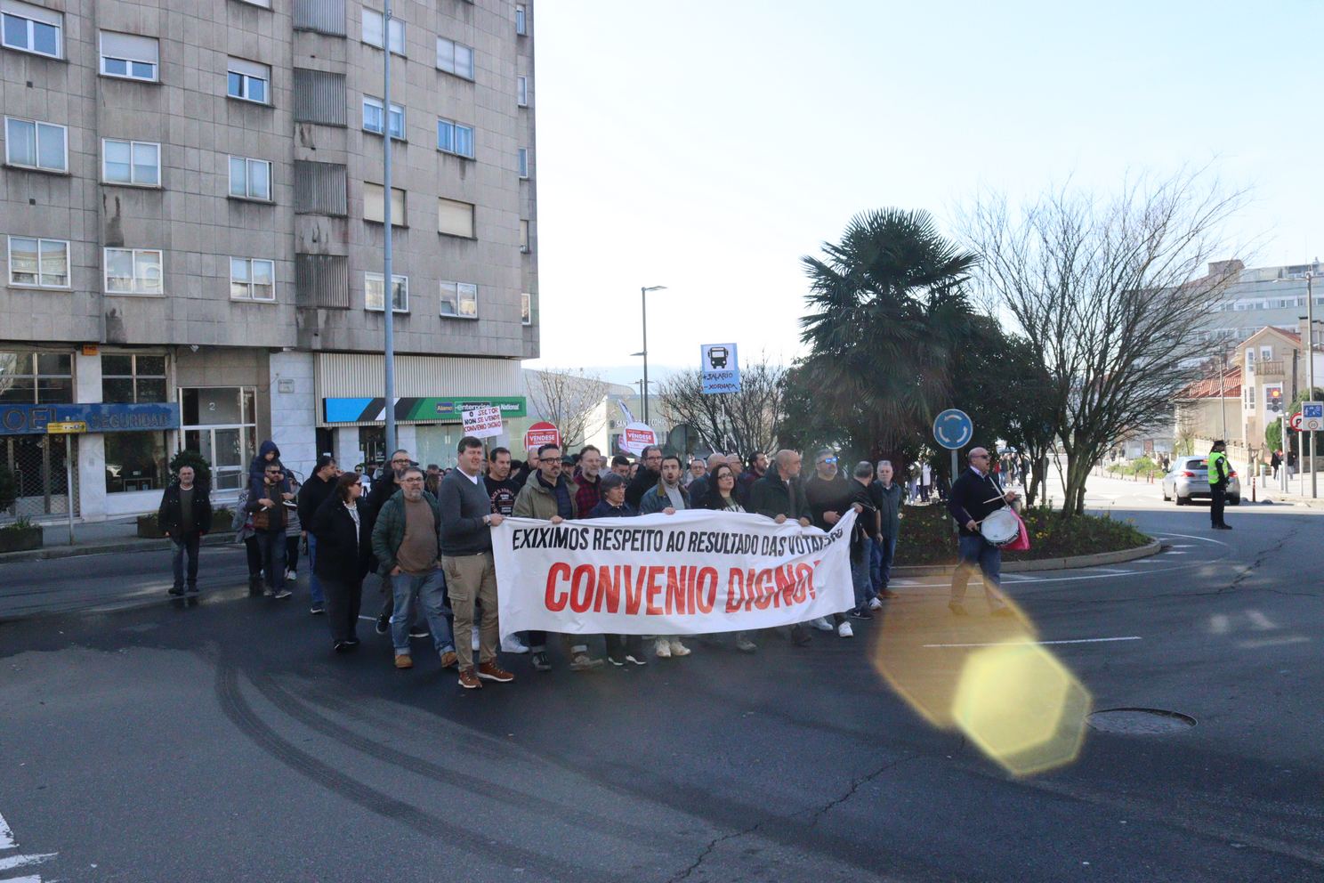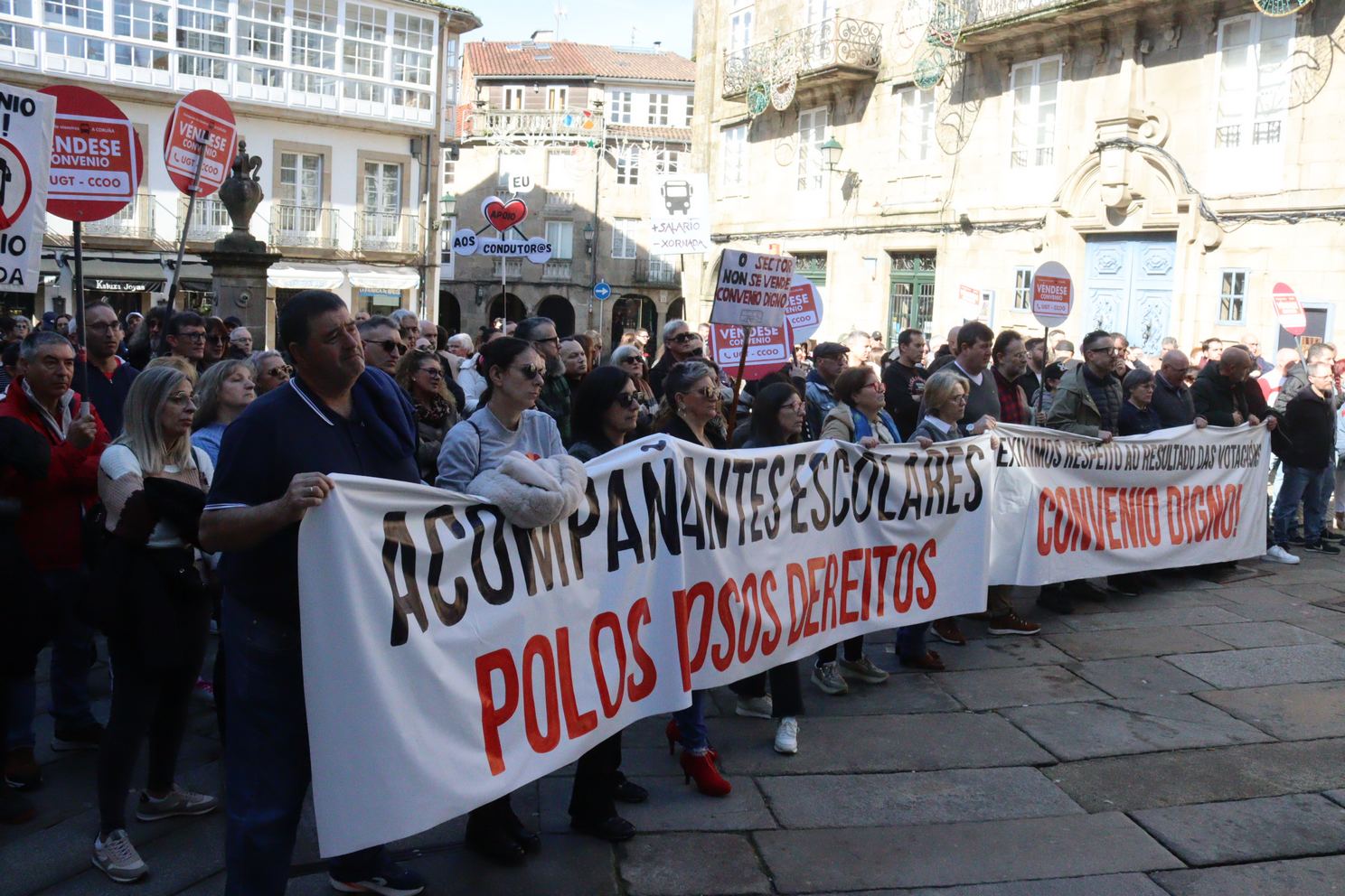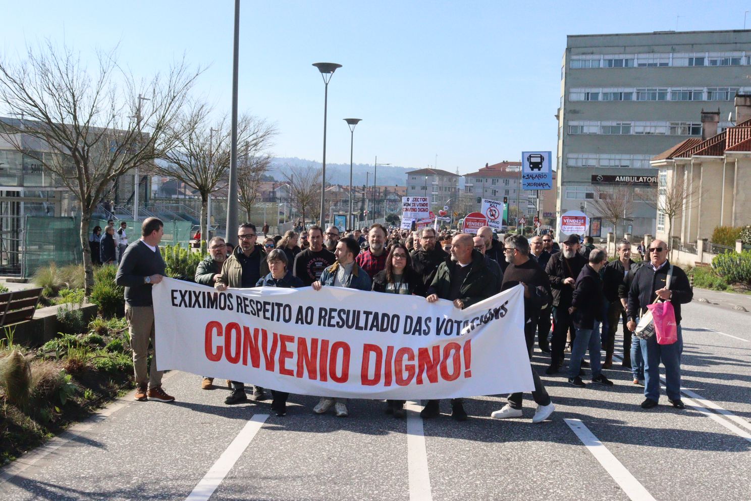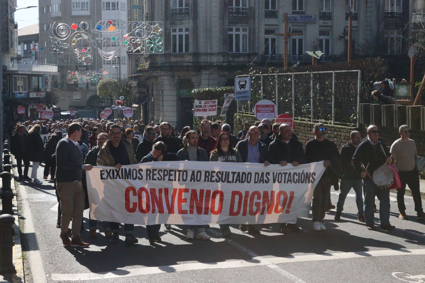 A manifestación, que partiu da estación intermodal de Santiago e rematou na Praza do Toural, estivo encabezada por unha faixa cunha mensaxe clara dirixida á patronal e aos sindicatos estatais: “exiximos respecto ao resultado das votacións, convenio digno”, en referencia ao rotundo rexeitamento do acordo asinado no marco da mediación, que recibiu a oposición de 831 persoas traballadoras no referendo celebrado o 4 de febreiro. Un referendo que, hai que salientar, era vinculante para todas as partes.