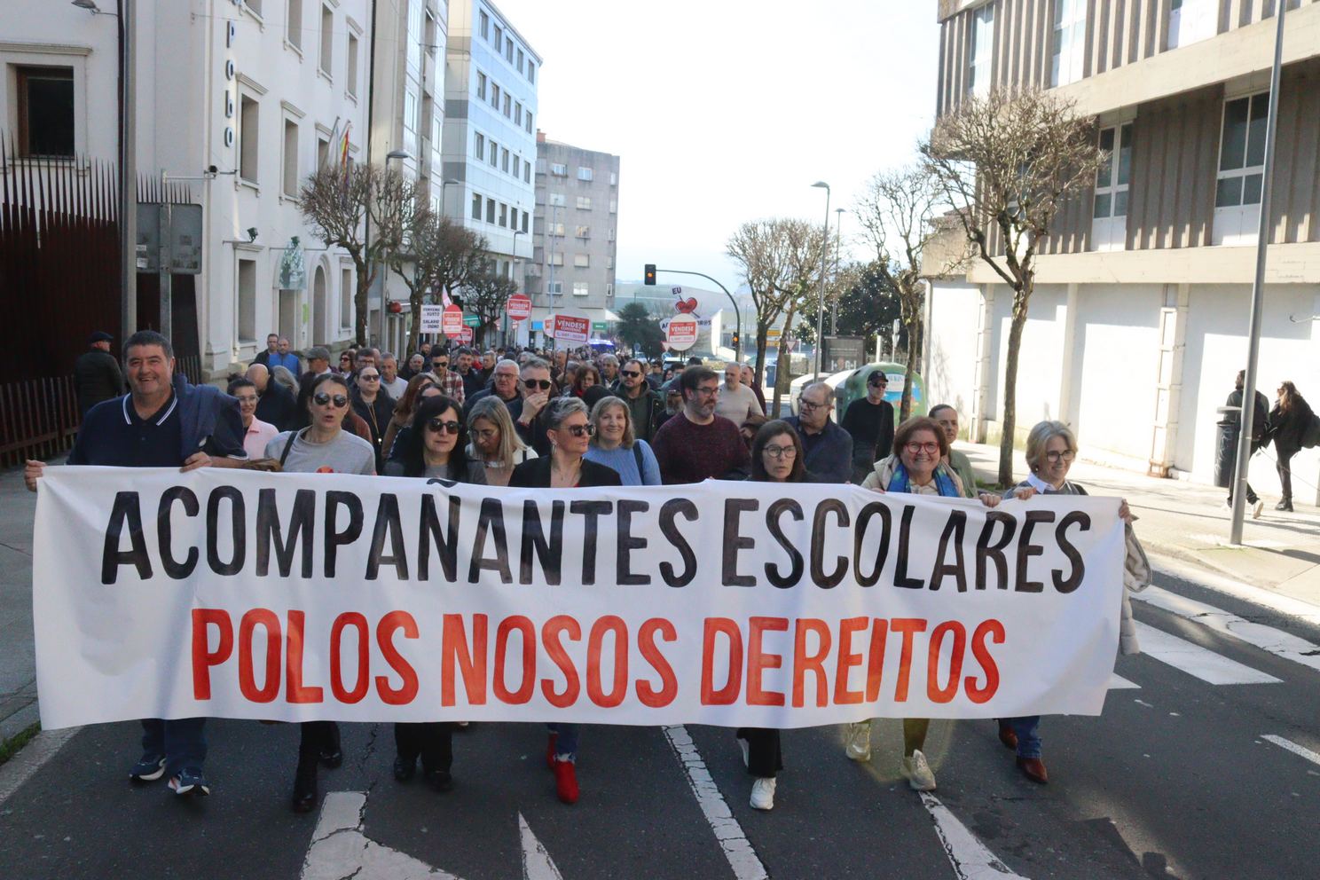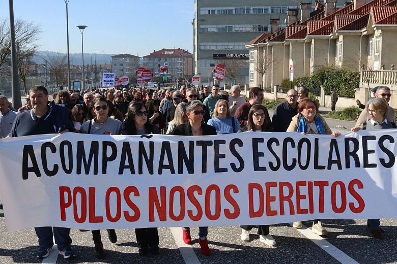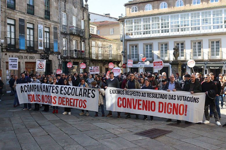 Na manifestación deste domingo, o persoal acompañante do transporte escolar portaba tamén a súa propia faixa demandado avances nas condicións de traballo, altamente precarizadas e que aínda empeoran con este acordo, tal e como denunciou, Nieves Paz, ao remate da protesta.