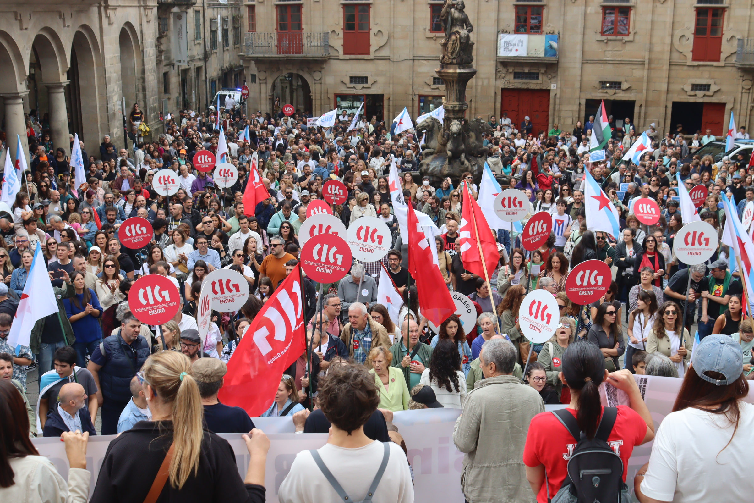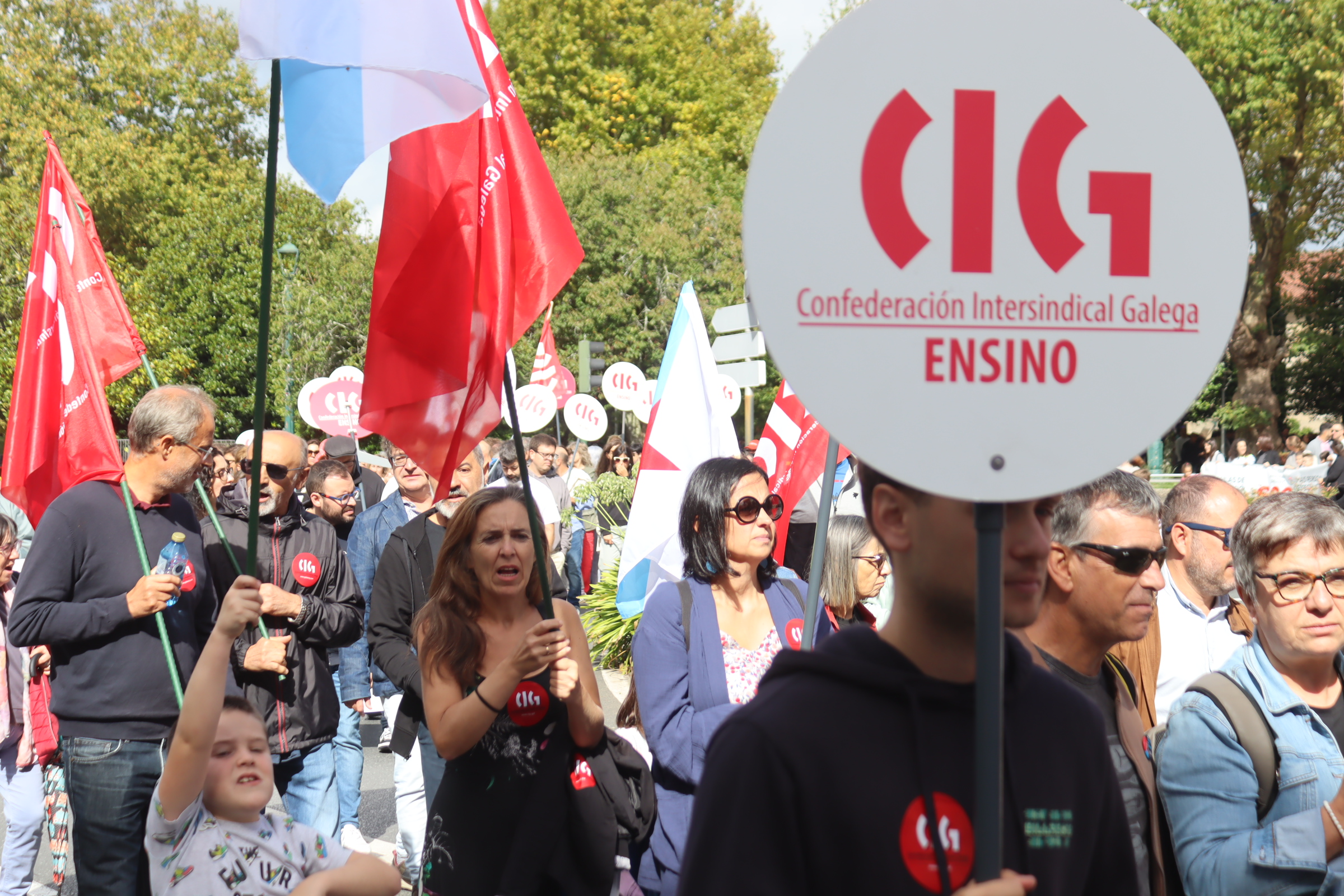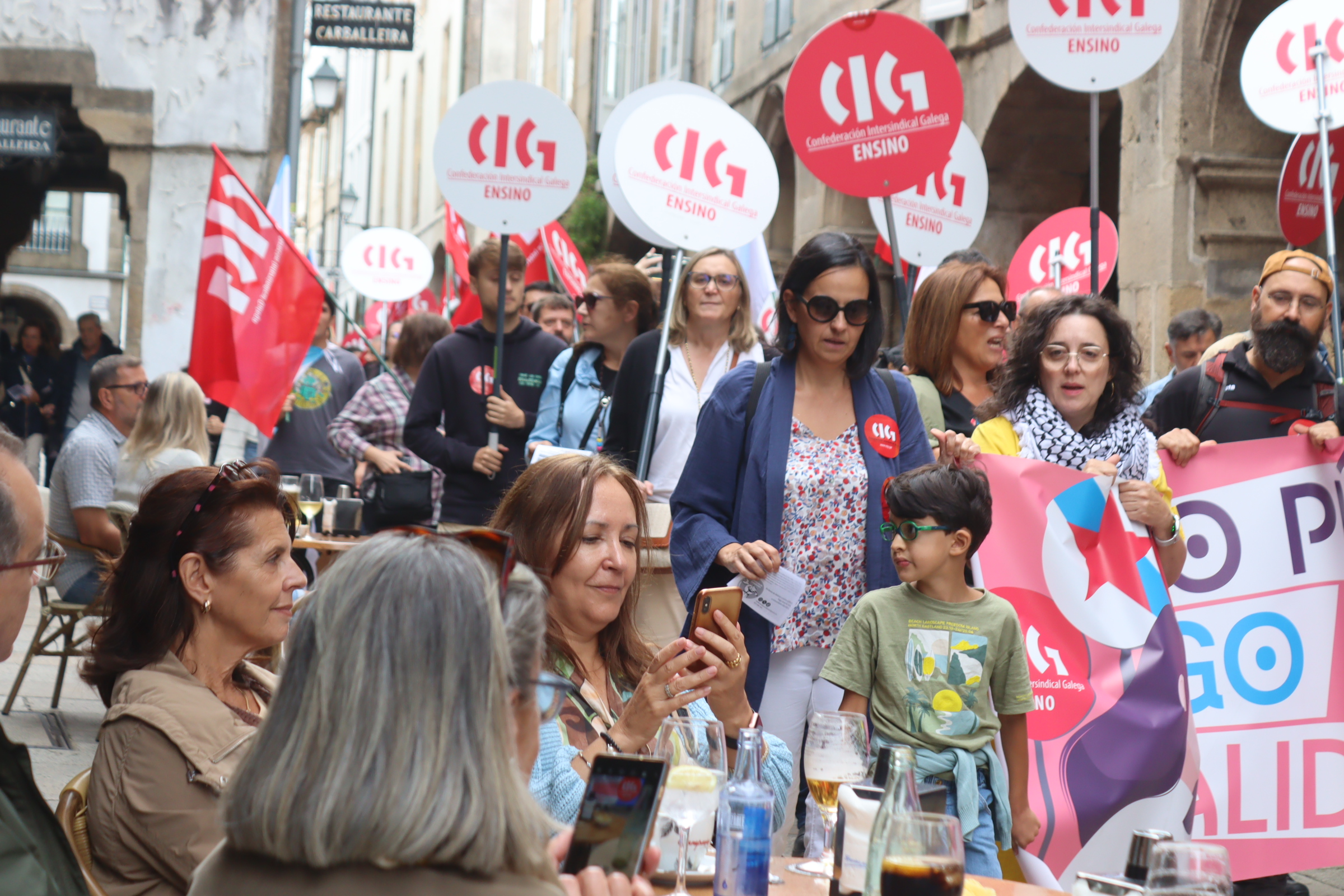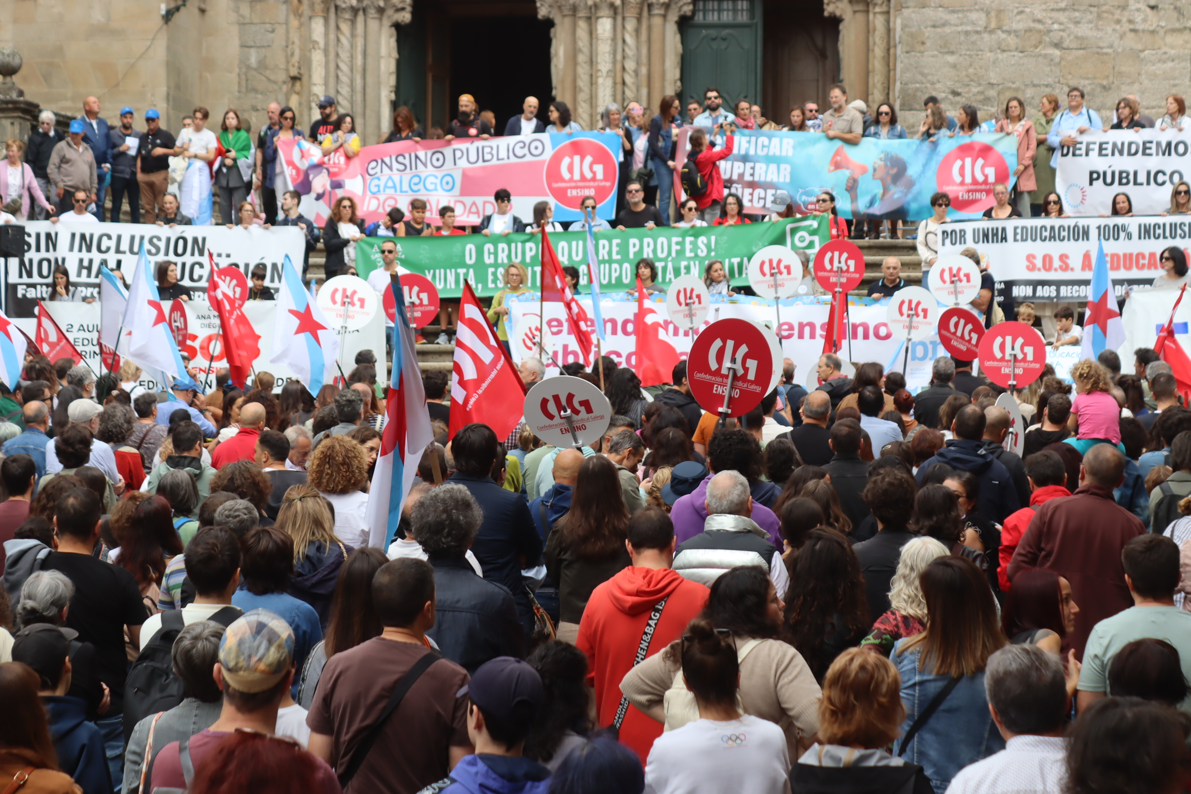 A comunidade educativa -profesorado, ANPAS e organizacións estudantís- deuse cita esta mañá en Compostela para exixirlle á Xunta que aposte polo ensino público, que o fortaleza, que o coide e, como dixo ao remate da mobilización a secretaria nacional de CIG-Ensino, “que se deixe de propaganda e de falsificar números”.