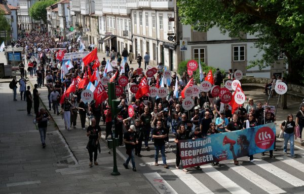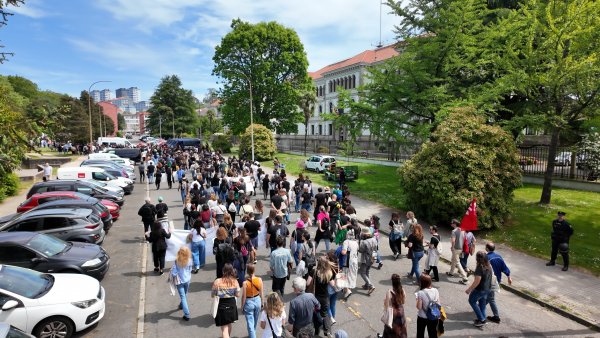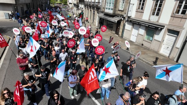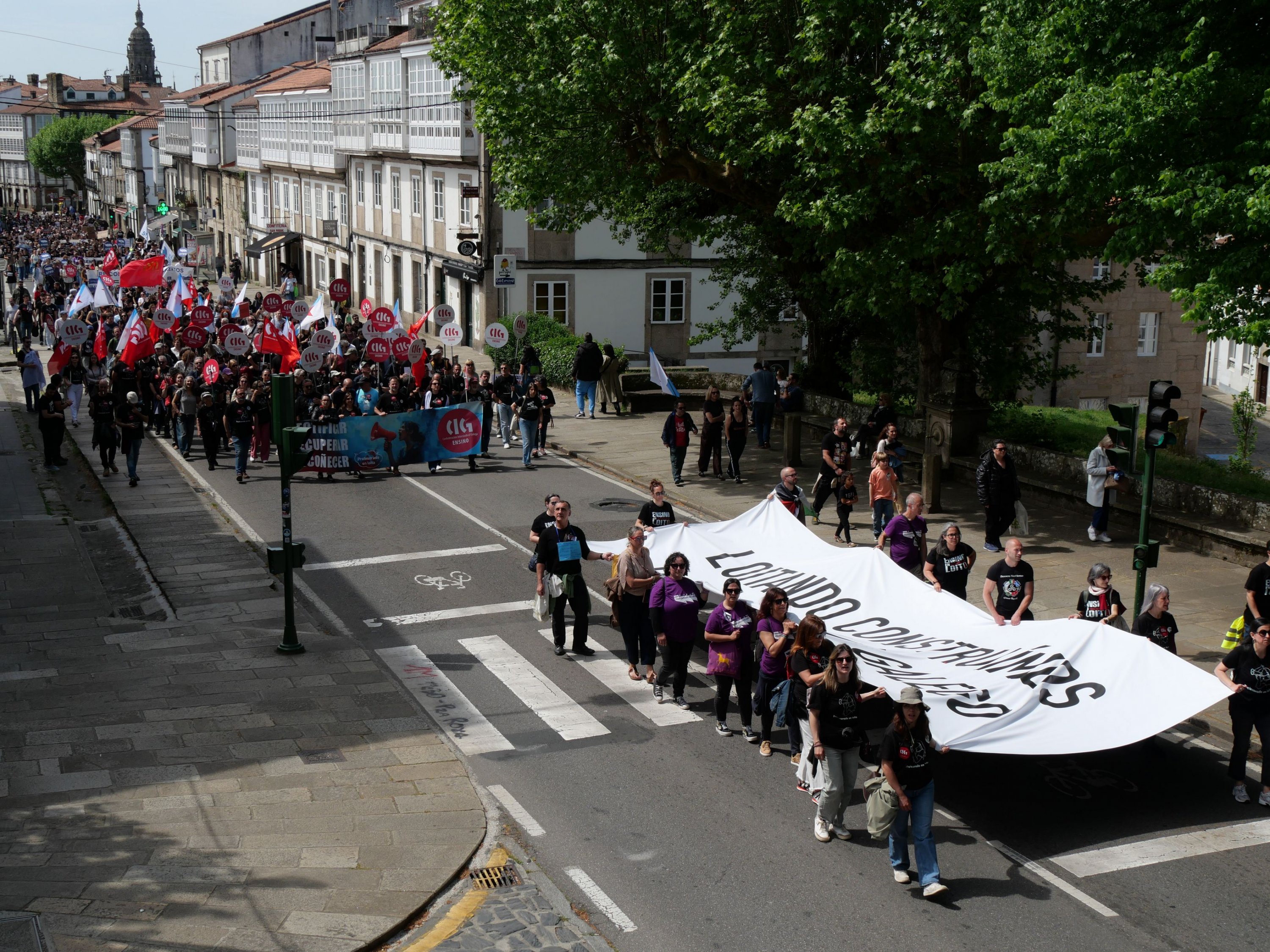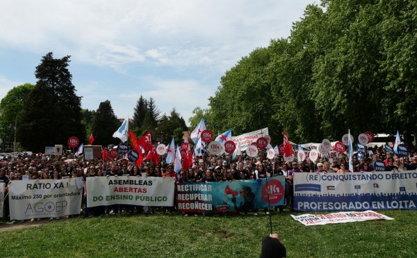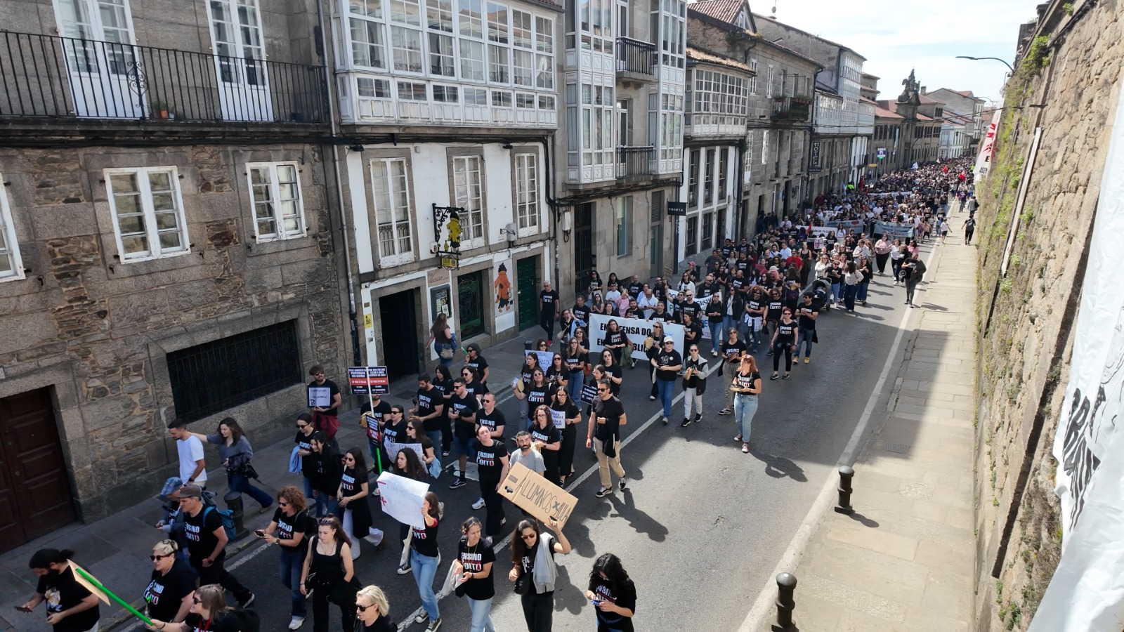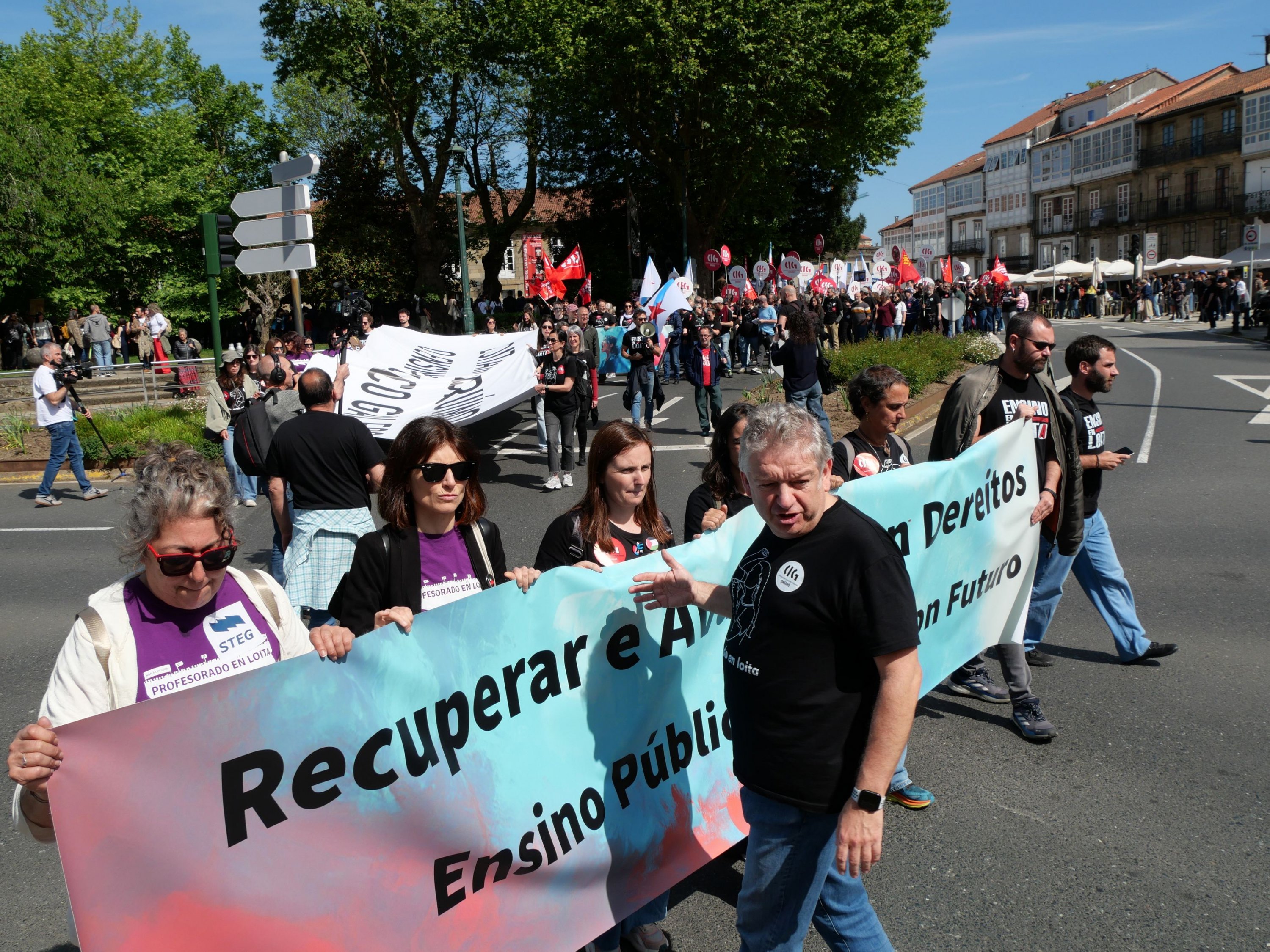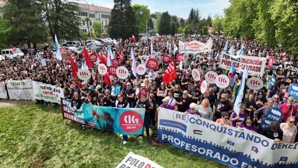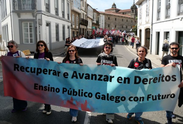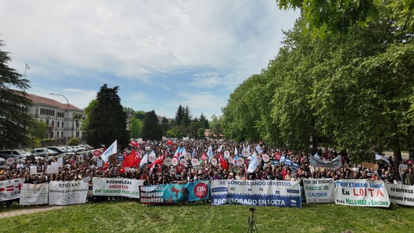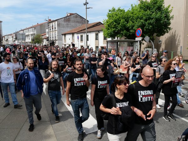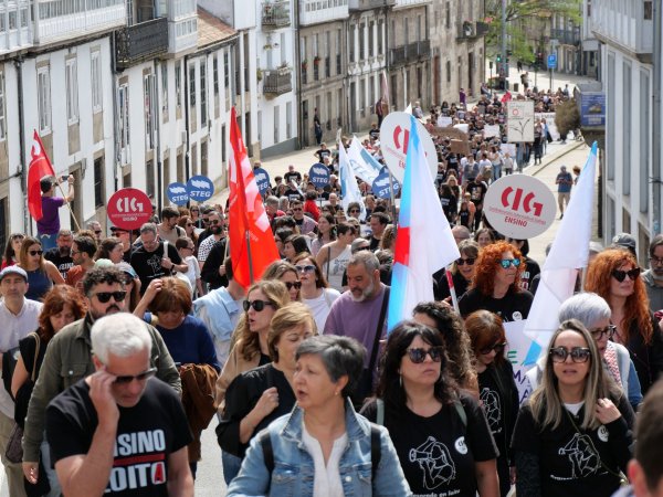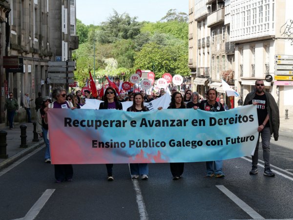 "Estamos fartas de fotos e de propaganda por parte da Consellaría de Educación e mais do sindicatos que asinan ese acordos de vergoña. Queremos melloras reais e concretas e que comecen a aplicarse xa o curso que vén". A secretaria nacional da CIG-Ensino, Laura Arroxo, realizaba estas declaracións ao inicio da manifestación que, baixo o lema “recuperar e avanzar en dereitos”, este martes reuniu a máis de 5.000 persoas na capital galega, maioritariamente docentes, pero tamén alumnado e familias.