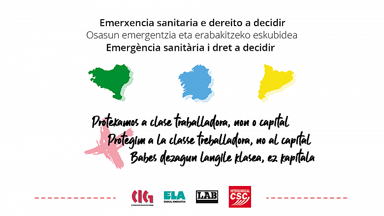 Os sindicatos CIG, ELA, LAB e I-CSC veñen de subscribir un manifesto en demanda de que se protexa á clase traballadora e non o capital na actual situación de emerxencia sanitaria. Reclaman ademais o dereito a decidir ante a crise sanitaria e os retos económicos, sociais e políticos que haberá que enfrontar agora e despois.