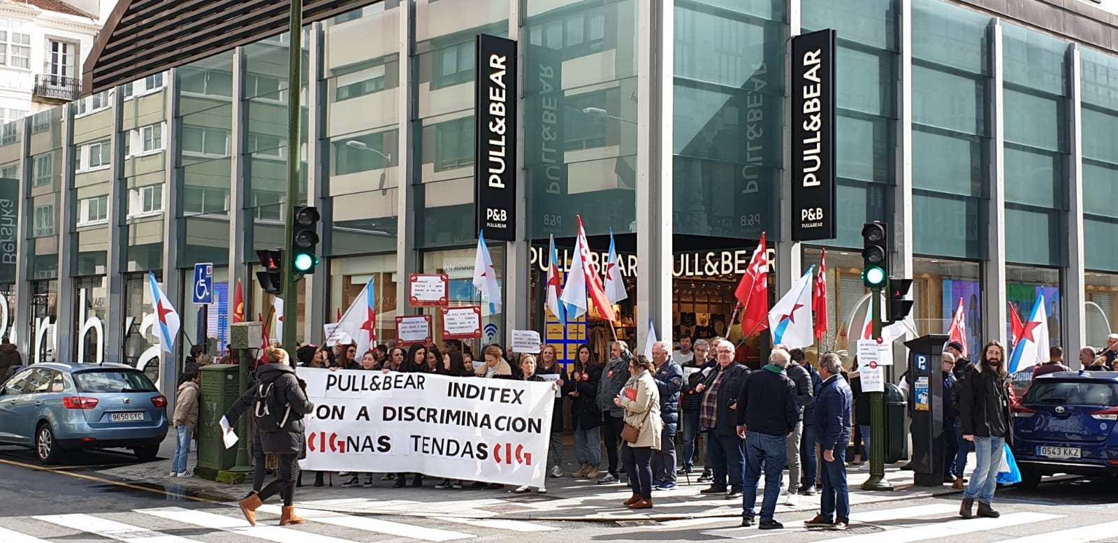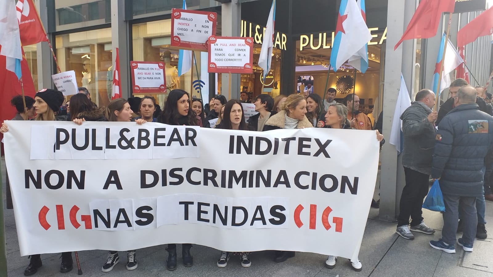 Traballadoras e traballadores de Pull&Bear concentráronse este venres na tenda que a cadea ten na Praza de Lugo da Coruña para demandar que se amplíen as xornadas a tempo parcial a 40 horas, que se contrate máis persoal para afrontar a elevada carga de traballo e que se implante un réxime de descansos lóxico e en consonancia co que existe para o resto das marcas do Grupo Inditex.