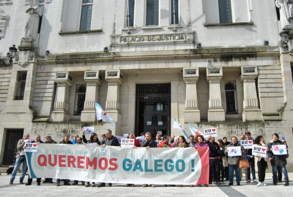 A plataforma cidadá Queremos Galego, composta por máis de 600 colectivos sociais de todo tipo concentrouse esta mañá ás portas da sede do Tribunal Superior de Xustiza de Galiza, para mostrar o seu rexeitamento á sentenza da Sala do contencioso-administrativo, xa recorrida polo Concello de Lugo.