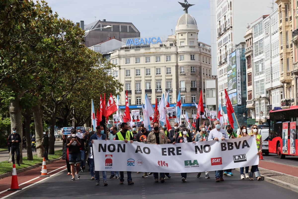 O BBVA obtivo no 1º trimestre do ano uns beneficios de 1200 millóns de euros e vén de subir de maneira escandalosa os salarios da alta cúpula directiva. Porén, estase aproveitando das facilidades da reforma laboral do PP (que o goberno de coalición segue sen derrogar) para tentar impor un ERE extintivo, unha modificación das condicións laborais e un expediente de mobilidade xeográfica que afectará a máis de 3000 empregadas/os e suporá o peche, só en Galiza, de 26 oficinas.