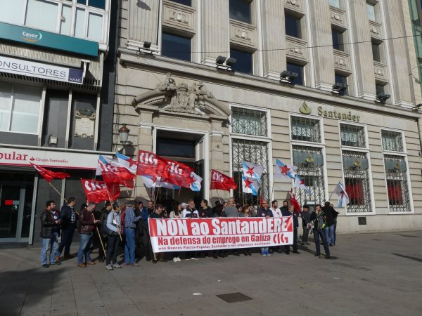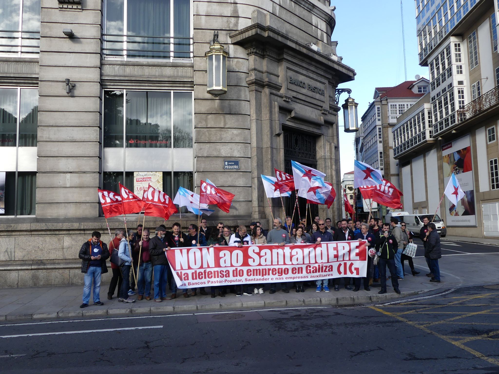 A CIG Banca continuou este xoves o calendario de mobilizacións contra os despedimentos colectivos formulados para o Grupo Popular-Pastor e Banco Santander, que en Galiza afectarán a unhas 200 traballadoras e traballadores, principalmente dos servizos centrais. Dende a central sindical reitérase que no banco "non sobra ninguén", pois mentres a dirección pon en marcha estes dous EREs, "no Banco Santander estase contratando persoal para oficinas a través de ETTs".