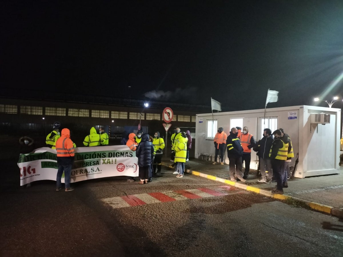 As traballadoras e os traballadores de Jofraas (auxiliar que realiza os servizos de limpeza industrial na factoría de Alcoa San Cibrao) acordaron iniciar folga indefinida dende hoxe, mércores 1 de decembro, para esixir un acordo que regule as condicións de traballo. A primeira xornada de paro está rexistrando un seguimento maioritario (supera o 80%), a pesar das presións de mandos intermedios da empresa para tratar de boicotear a folga, especialmente entre o persoal eventual, con ameazas de non renovacións de contrato ou despedimentos.
