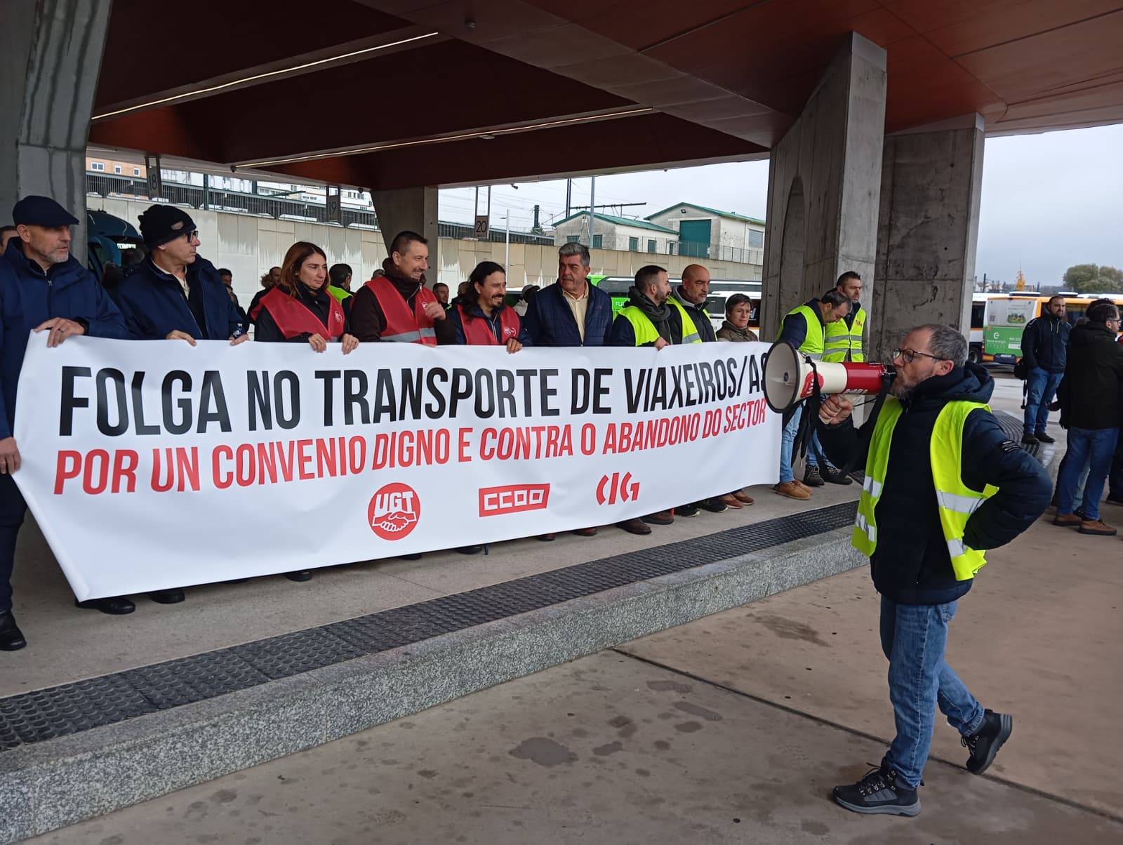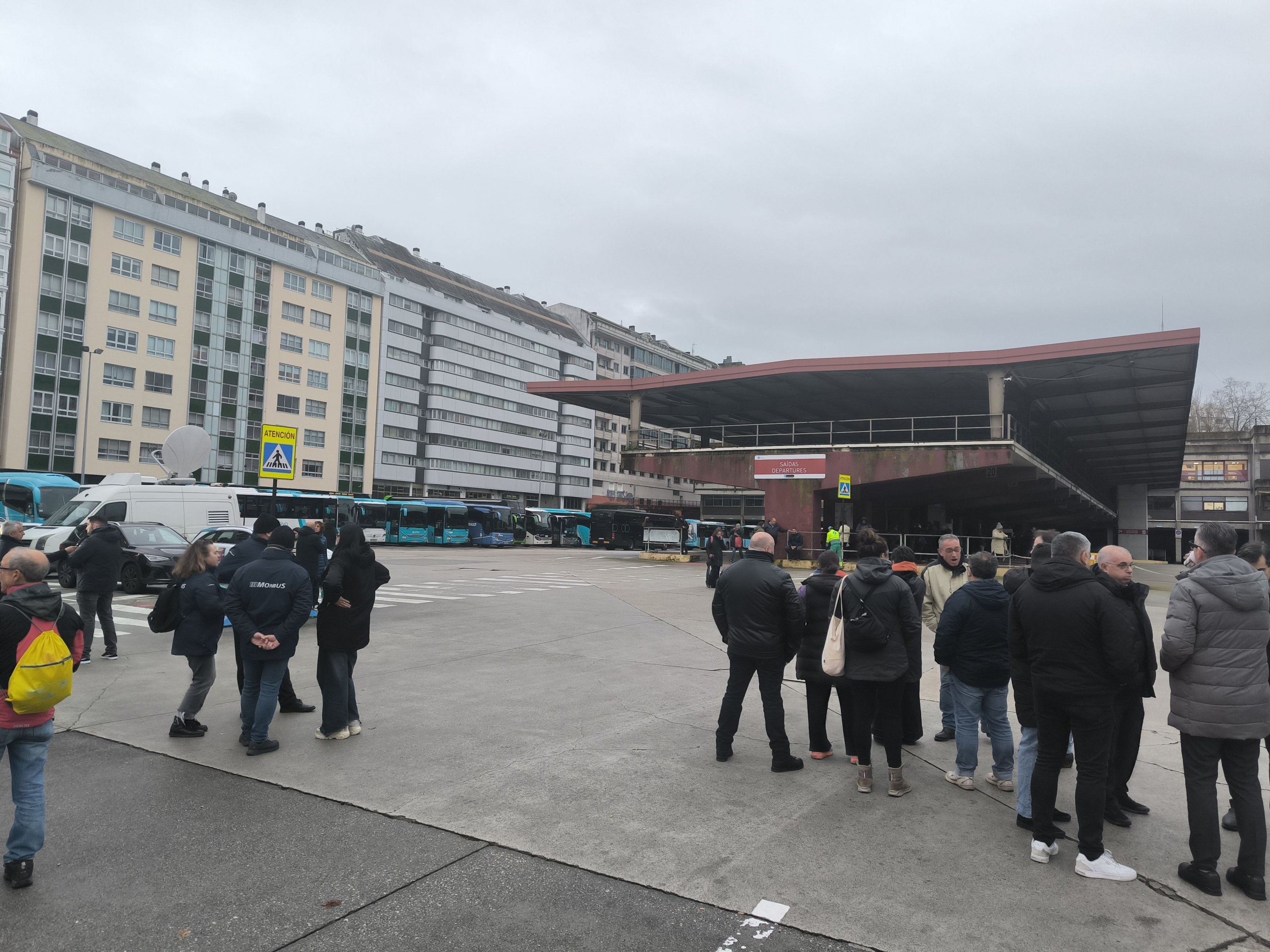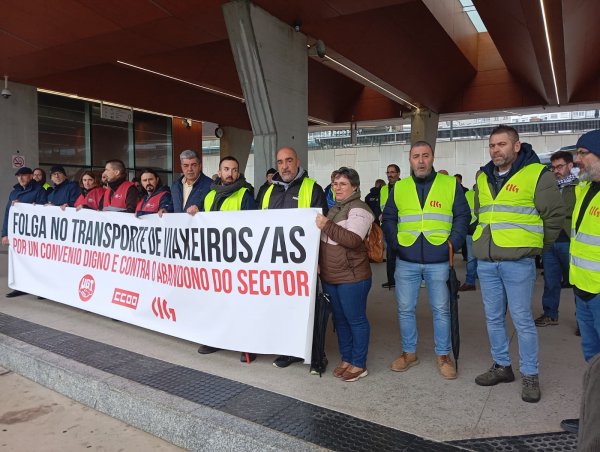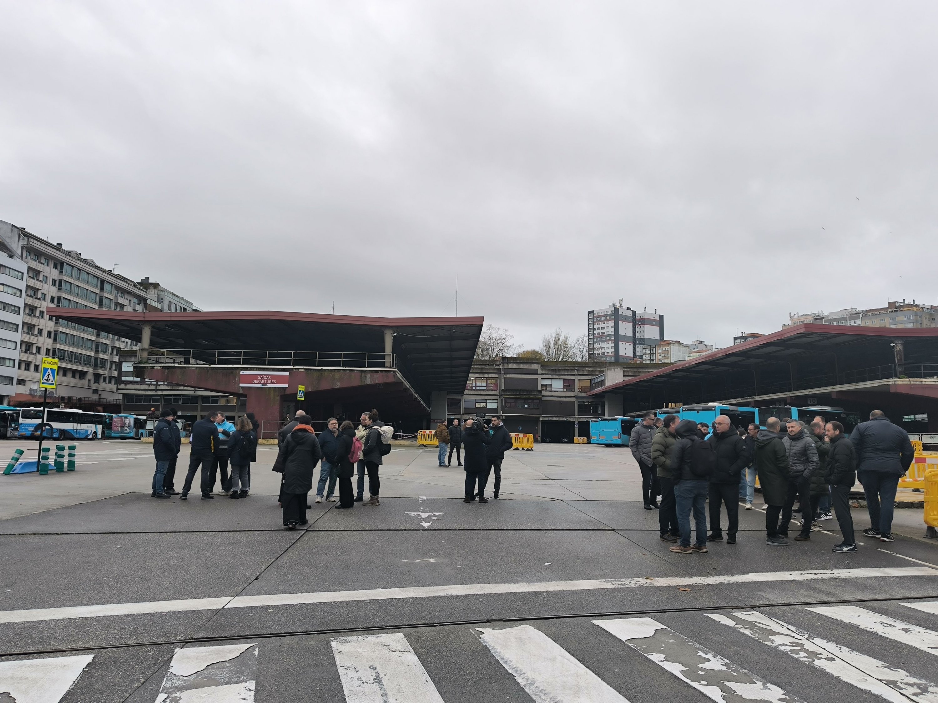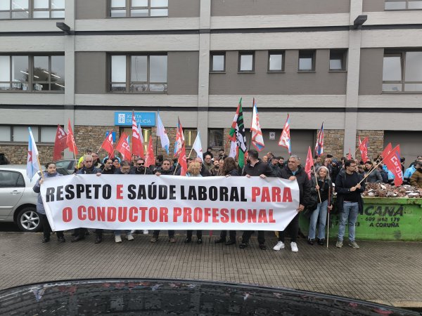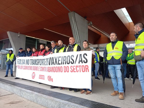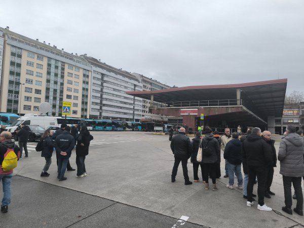 A primeira xornada de folga no servizo de transporte en autobús da provincia da Coruña está rexistrando un seguimento masivo entre o persoal que, para darlle máis visibilidade a súa reivindicación, tamén se concentrou durante a mañá na estación de Santiago de Compostela, diante da dirección xeral de Mobilidade na Coruña (á carón da estación) e ás portas do edificio da Xunta en Ferrol.