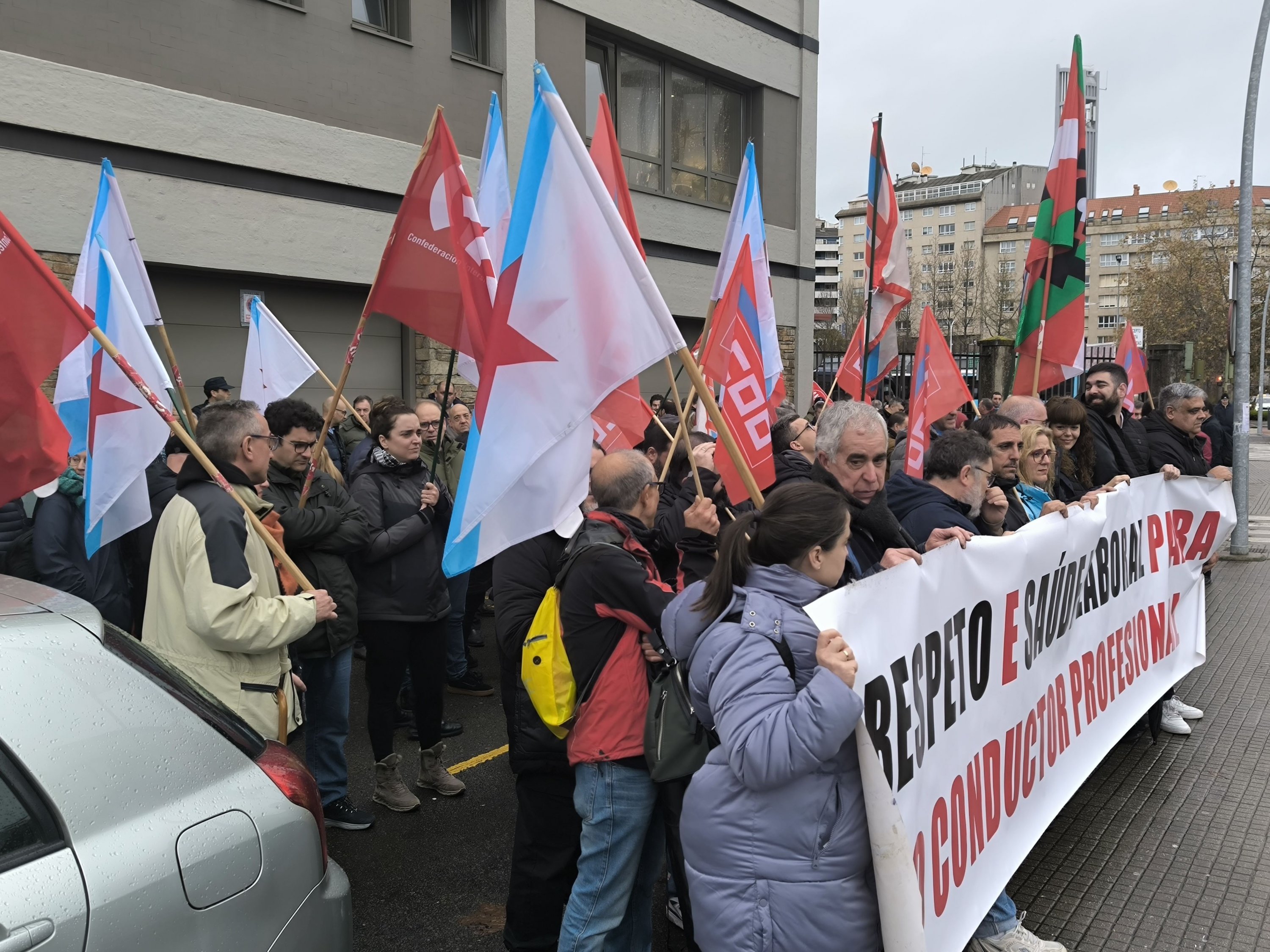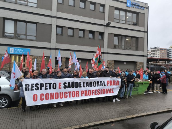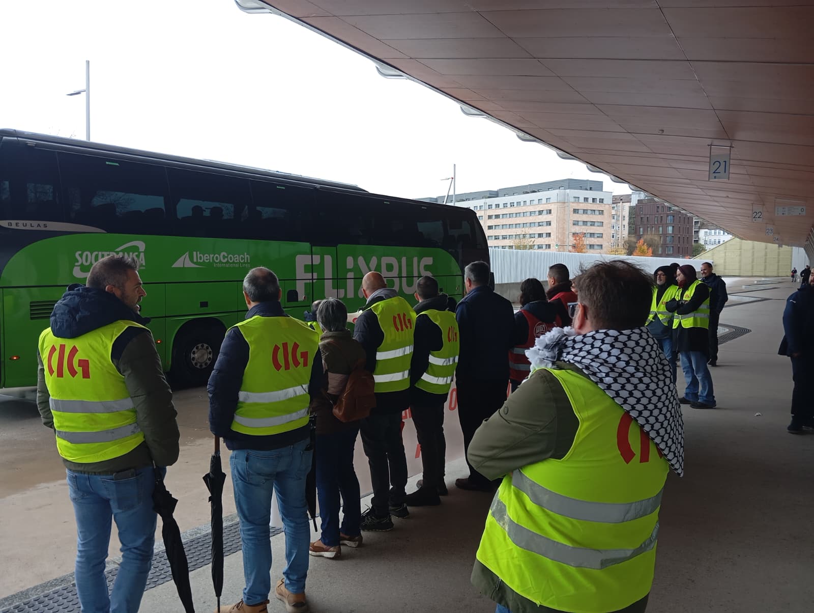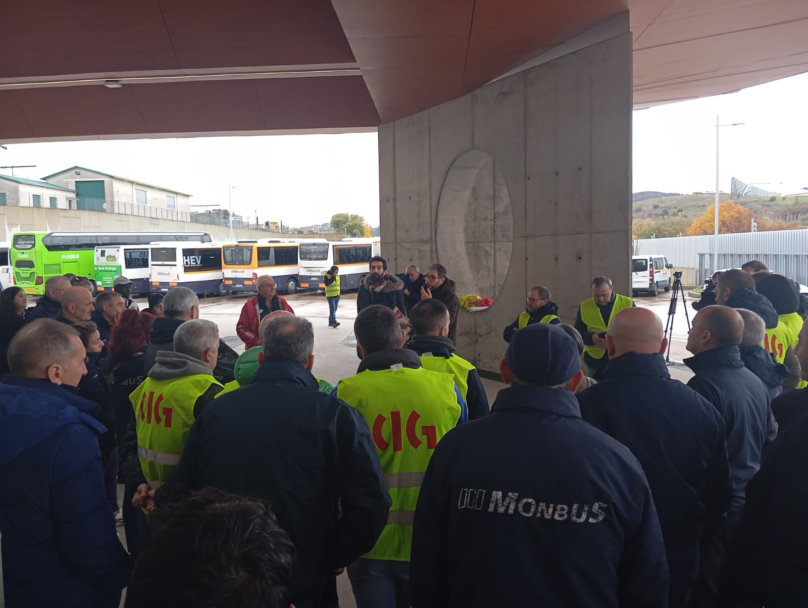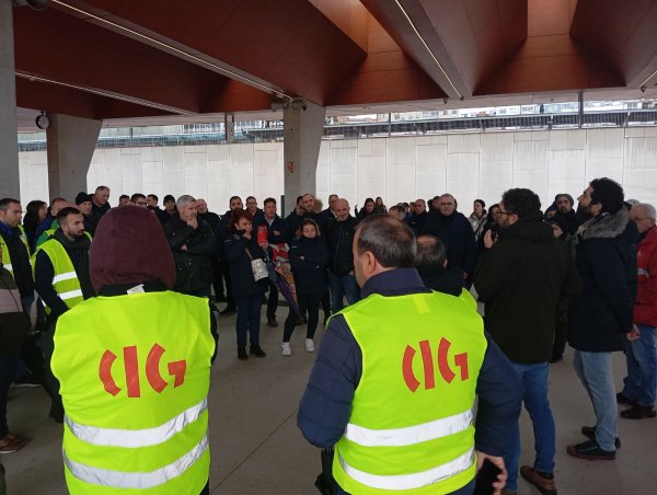 A primeira xornada de folga no servizo de transporte en autobús da provincia da Coruña está rexistrando un seguimento masivo entre o persoal que, para darlle máis visibilidade a súa reivindicación, tamén se concentrou durante a mañá na estación de Santiago de Compostela, diante da dirección xeral de Mobilidade na Coruña (á carón da estación) e ás portas do edificio da Xunta en Ferrol.