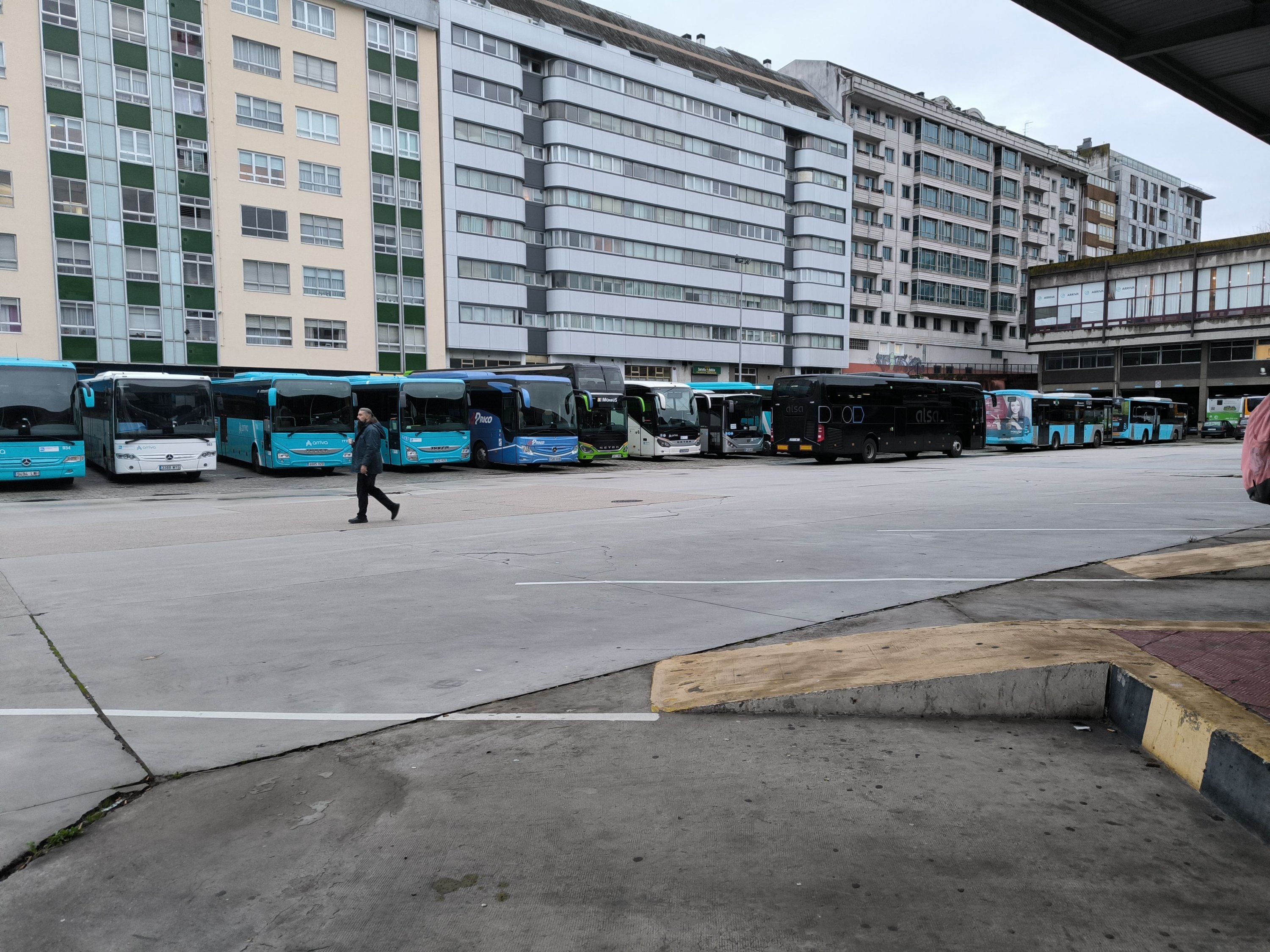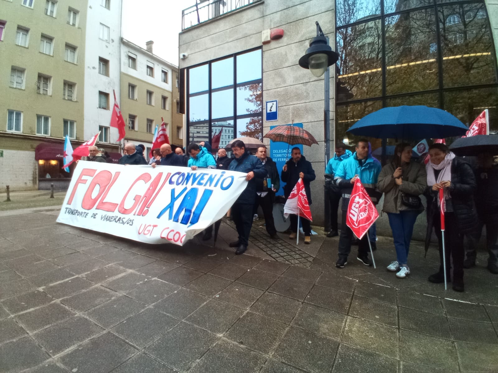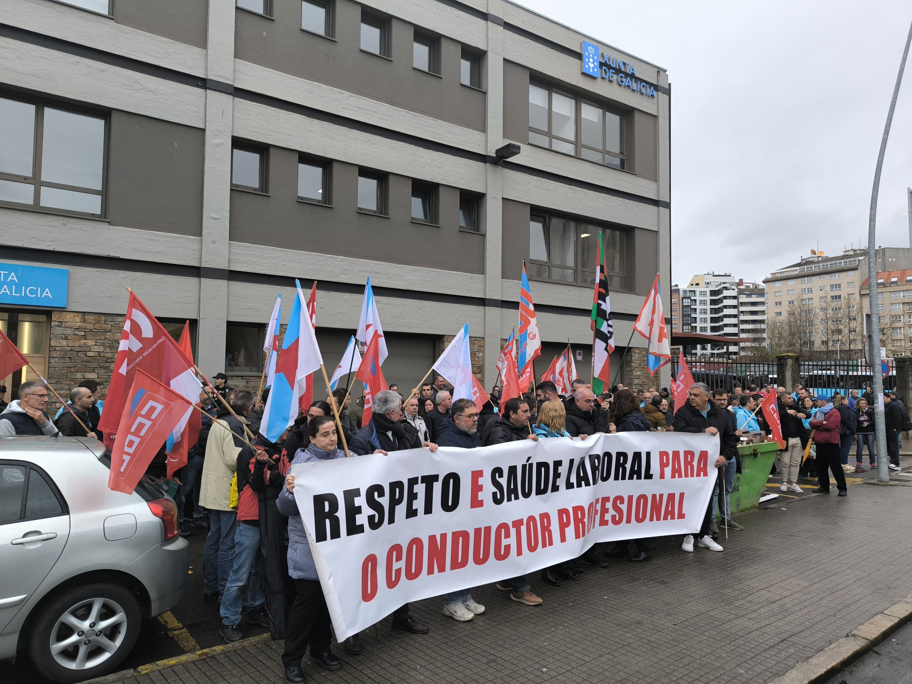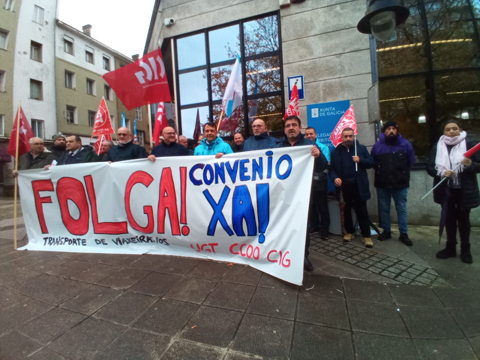 A primeira xornada de folga no servizo de transporte en autobús da provincia da Coruña está rexistrando un seguimento masivo entre o persoal que, para darlle máis visibilidade a súa reivindicación, tamén se concentrou durante a mañá na estación de Santiago de Compostela, diante da dirección xeral de Mobilidade na Coruña (á carón da estación) e ás portas do edificio da Xunta en Ferrol.