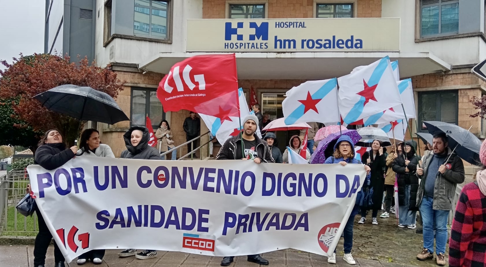 As traballadoras e os traballadores da sanidade privada da Coruña están secundando este xoves a primeira das nove xornadas de folga para reclamar un convenio xusto, con salarios dignos e unha mellora real das condicións laborais. Esta xeira de folgas enmárcase no intensísimo calendario de mobilizacións que as centrais sindicais teñen convocado no sector e vén sumarse aos paros e ás protestas que o persoal está a desenvolver dende setembro ante o inmobilismo patronal.