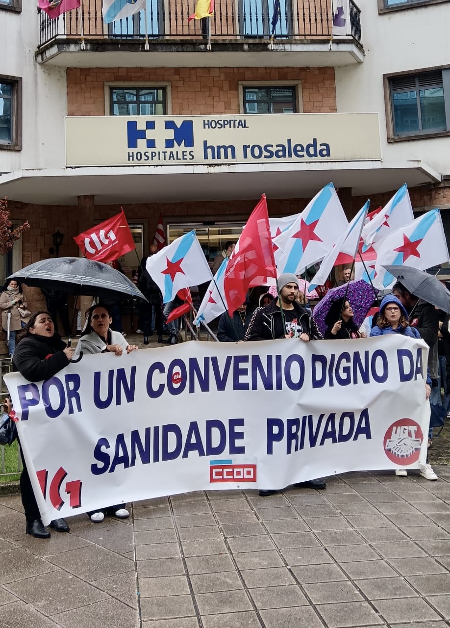 Para darlle visibilidade a súa loita, as traballadoras e traballadores concentráronse hoxe diante do Hospital QuironSalud na Coruña e na Rosaleda en Compostela e mañá, venres, repetirán mobilización ao mediodía diante da Rosaleda.