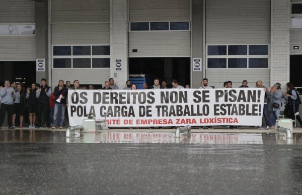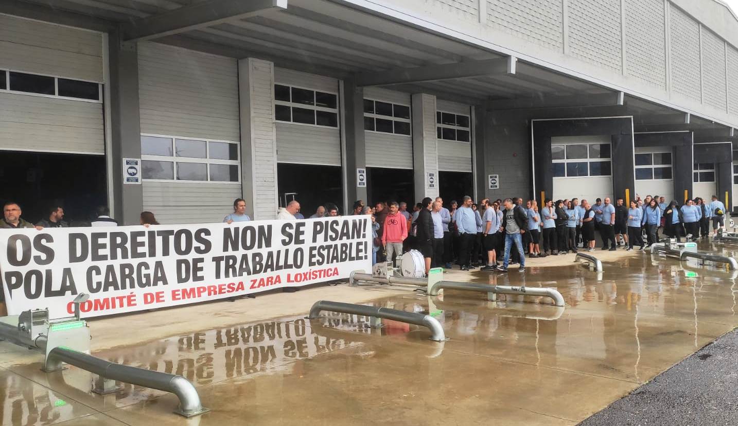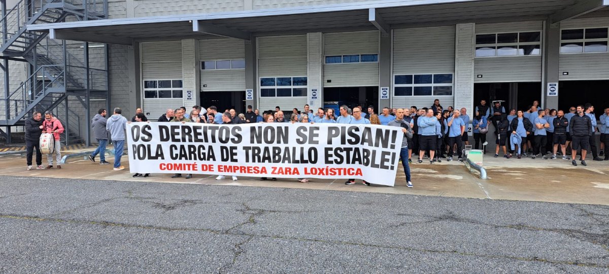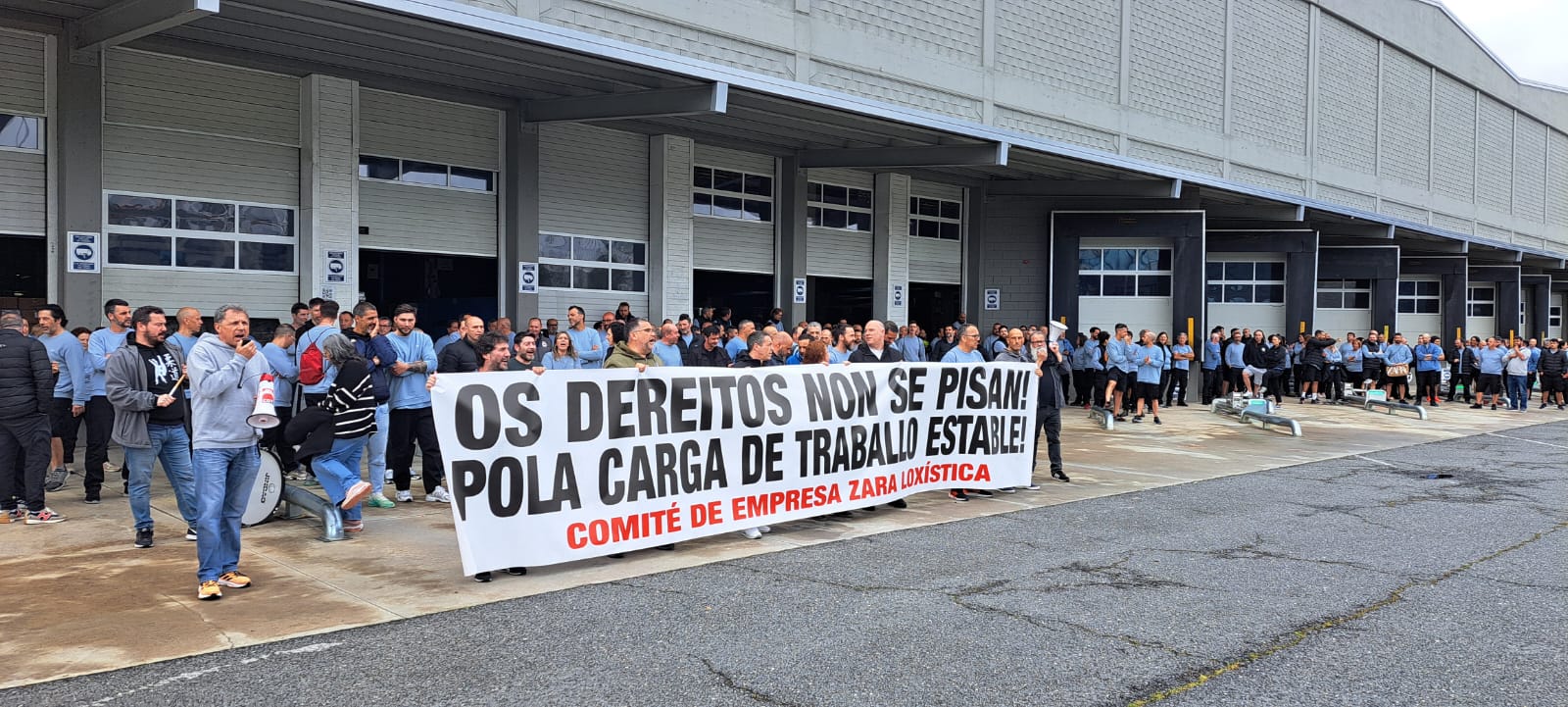 Despois da multitudinaria manifestación deste domingo, os traballadores e as traballadoras de Zara Loxística están secundando este luns paros de media xornada por cada quenda laboral en defensa dos seus dereitos e para reclamarlle a Inditex carga de traballo estábel no almacén. Os paros tiveron un seguimento de practicamente o 100% do persoal na quenda de noite a na da maña.