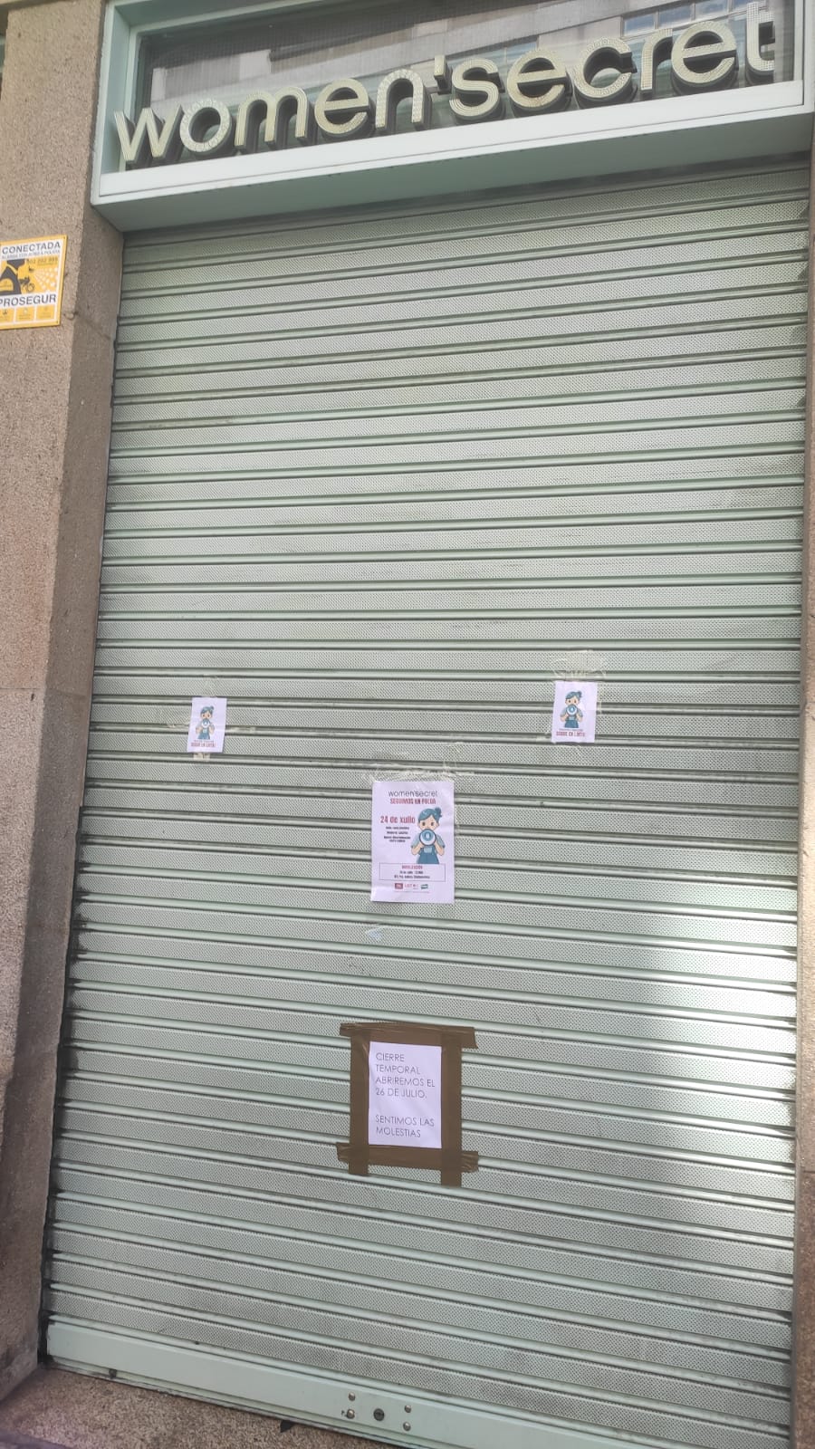 O 100% das traballadoras de Women' Secret na provincia da Coruña están secundando a folga convocada para este mércores (a terceira en menos dun mes) para demandarlle ao grupo Tendam que reforce de inmediato os cadros de persoal e os dote de estabilidade. O éxito do paro fai que as cinco tendas afectadas estean pechadas e para darlle máis visibilidade a súa xusta loita, as compañeiras concentráronse este mediodía diante do comercio que a compañía ten nas inmediacións da Praza de Galiza, en Santiago de Compostela.