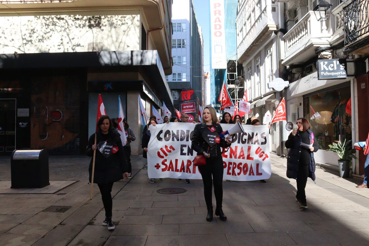 "O salario de Arenal non nos chega para xantar", "vivimos fatal traballando en Arenal", "o paraugas de agasallo a conta do salario" ou "perfumes de luxo, salarios de lixo" foron algunhas das consignas que berraron as traballadoras e os traballadores na mobilización. Ademais, o persoal decidiu acudir vestido de negro e cun cadaleito para simbolizar o enterro das malas condicións laborais, os baixos salarios e a sobrecarga de traballo, rematando así dunha vez coa precariedade.