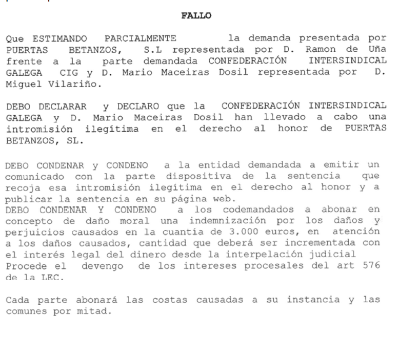 A CIG discrepa do fallo da sentenza 00317/2025 emitida pola Praza nº1 da sección civil e de instrución do tribunal de instancia de Betanzos ao entender que non se vulnerou ningún dereito fundamental da empresa demandante e que a información feita pública pola CIG se enmarca na acción sindical que lle é propia na defensa dos dereitos laborais.