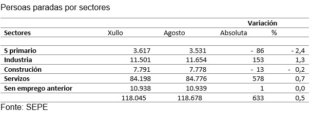 No que atinxe ás persoas inscritas como paradas no SEPE, o medre do desemprego rexistrouse en todas as provincias. Porén o maior descenso do desemprego correspondeuse, sobre todo, coa provincia de Pontevedra, aínda que na de Coruña o crecemento tamén foi cero. Polo tanto ten que ver coas provincias do litoral nas que, pola súa situación xeográfica o turismo ten máis importancia, sobre todo en época estival.