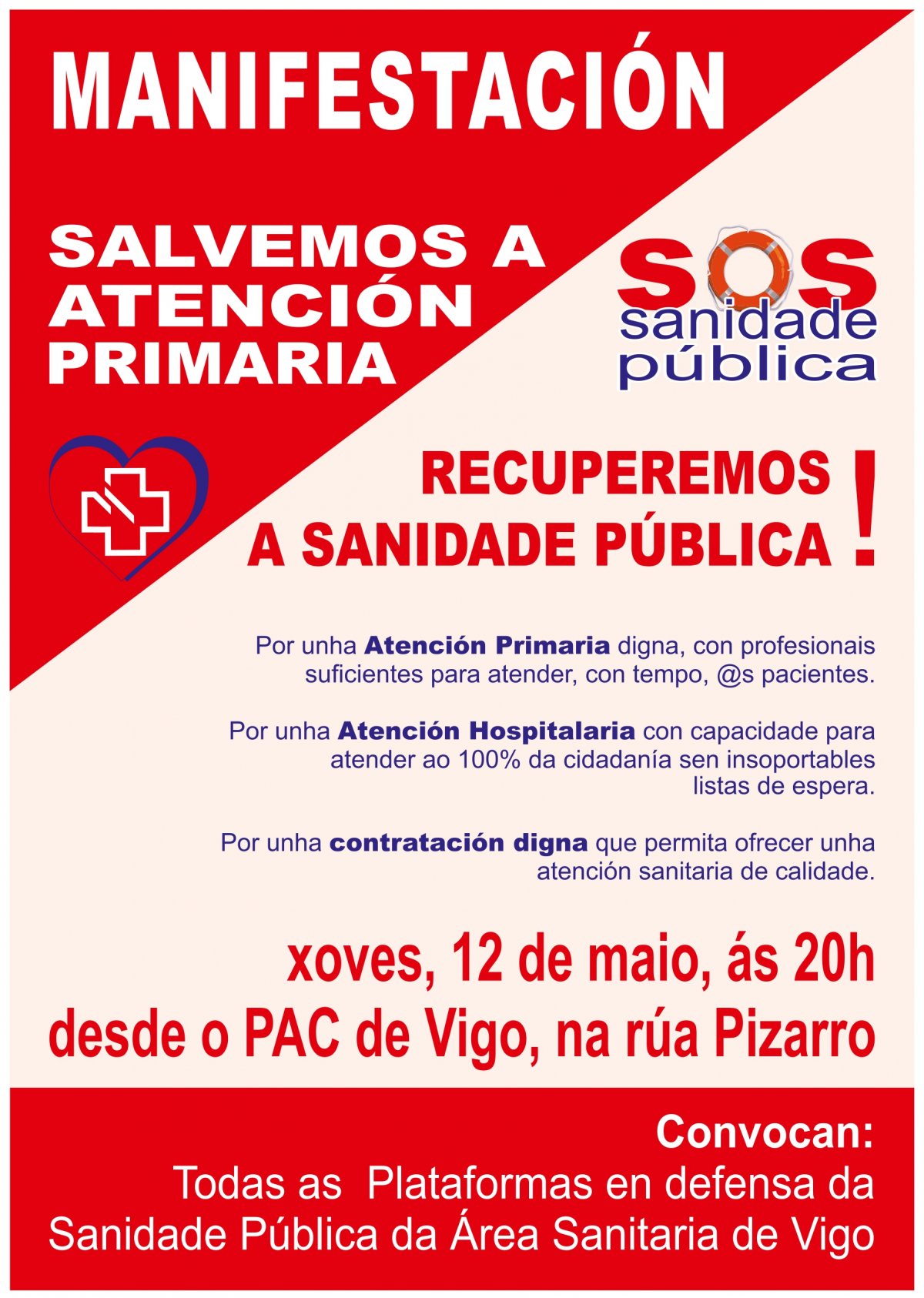 A Plataforma SOS Sanidade Pública da área sanitaria de Vigo acordou convocar unha manifestación en defensa da atención primaria o vindeiro xoves 12 de maio ante a “profunda crise estrutural” que atravesa este servizo. A CIG, que fai parte da Plataforma, chama a participar nunha marcha sairá dende o PAC da rúa Pizarro ás 20:00 horas baixo o lema 'Salvemos a atención primaria. Recuperemos a sanidade pública'.