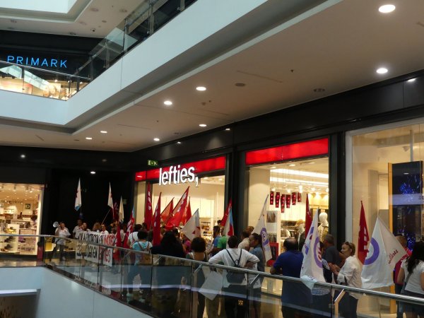 Traballadoras da tenda de Lefties das Cancelas, en Santiago de Compostela mobilizáronse esta mañá para denunciar a explotación laboral á que se ven sometidas. Tras concentrarse ás portas do centro comercial percorreron os corredores para rematar cunha concentración ás portas da propia tenda entre cánticos de “estamos explotadas, estamos explotadas, en Lefties nos explotan e Amancio non fai nada”.