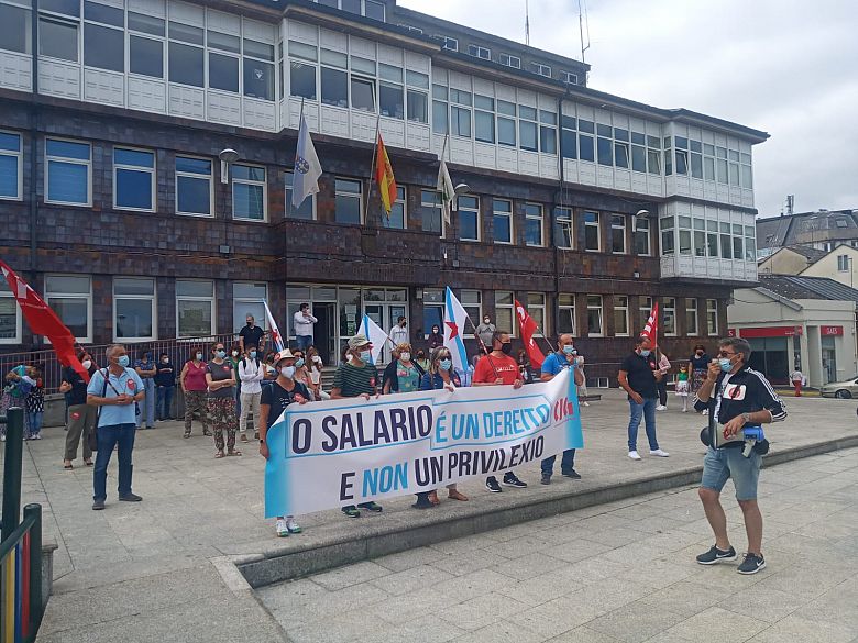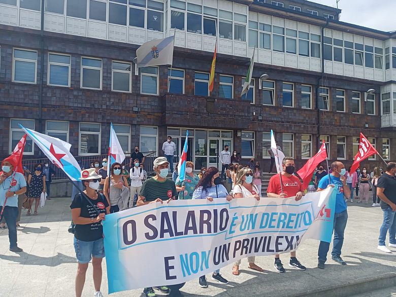 Traballadoras e traballadores dos servizos de limpeza e conserxería dos colexios e pavillóns que dependen do Concello de Vilalba concentráronse este xoves diante da casa consistorial para esixir o cobro das débedas salariais que a anterior concesionaria, Limpezas García Galcar, ten pendentes de abonar e reclamar que se reincorpore á compañeira a que Tragsa, nova adxudicataria, se negou a subrogar.
