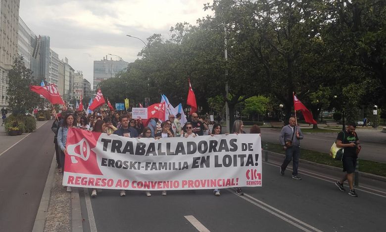 Traballadoras e traballadores de Eroski-Familia manifestáronse este domingo polas rúas da Coruña para reclamar unhas condicións salariais e laborais dignas. Na marcha participou persoal da provincia da Coruña e de Pontevedra, dando así continuidade ás mobilizacións que a CIG iniciou dende hai meses para demandarlle á empresa que regrese ao convenio do comercio de alimentación, do que saíu no ano 2006 para pasar a aplicar un convenio propio de condicións inferiores negociado en Madrid.
