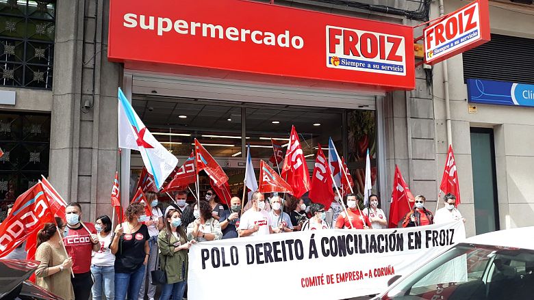 O comité de Froiz na provincia da Coruña realizou este venres unha concentración diante do supermercado que a empresa ten na Avenida de Oza da Coruña para exixir da empresa que manteña as xornadas intensivas implantadas durante o estado de alarma provocado pola pandemia da Covid19.