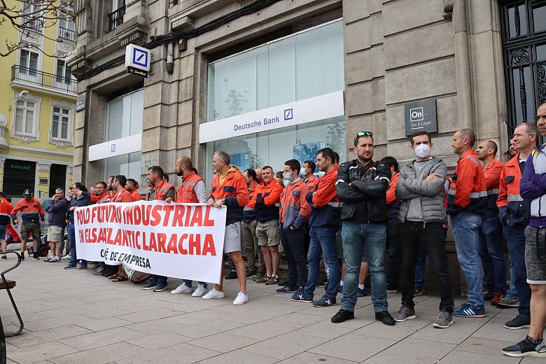 Traballadores de Celsa Atlantic concentráronse este venres diante da oficina que a entidade Deutsche Bank ten na Coruña para manifestar a profunda preocupación ante a grave situación que atreva a factoría da Laracha pola falta de financiamento, nun momento no que o desacordo cos fondos de acredores para reestruturar a débeda da empresa pon en risco a vía do financiamento público.