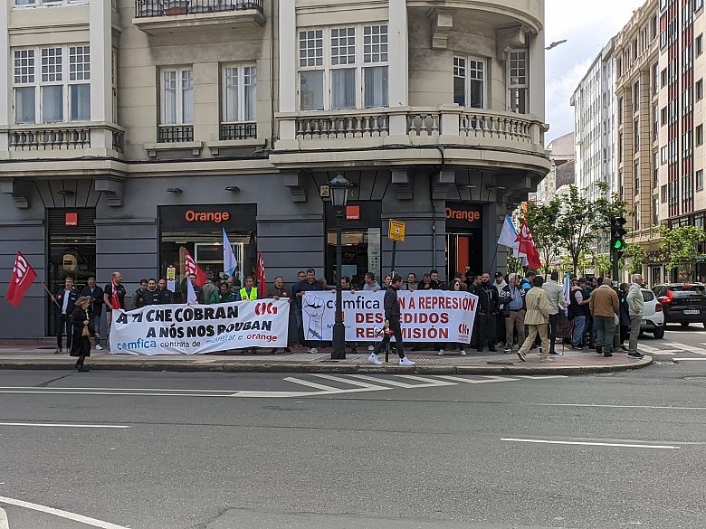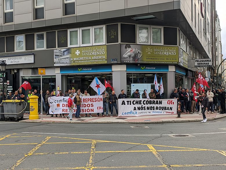 Traballadores e traballadoras de Comfica Bergondo realizaron dúas concentracións este sábado para denunciar a situación de precariedade laboral que padecen. Este persoal presta servizos para Movistar e Orange e por este motivo as concentracións desenvolvéronse diante das tendas que estas compañías teñen na Praza de Pontevedra da Coruña.