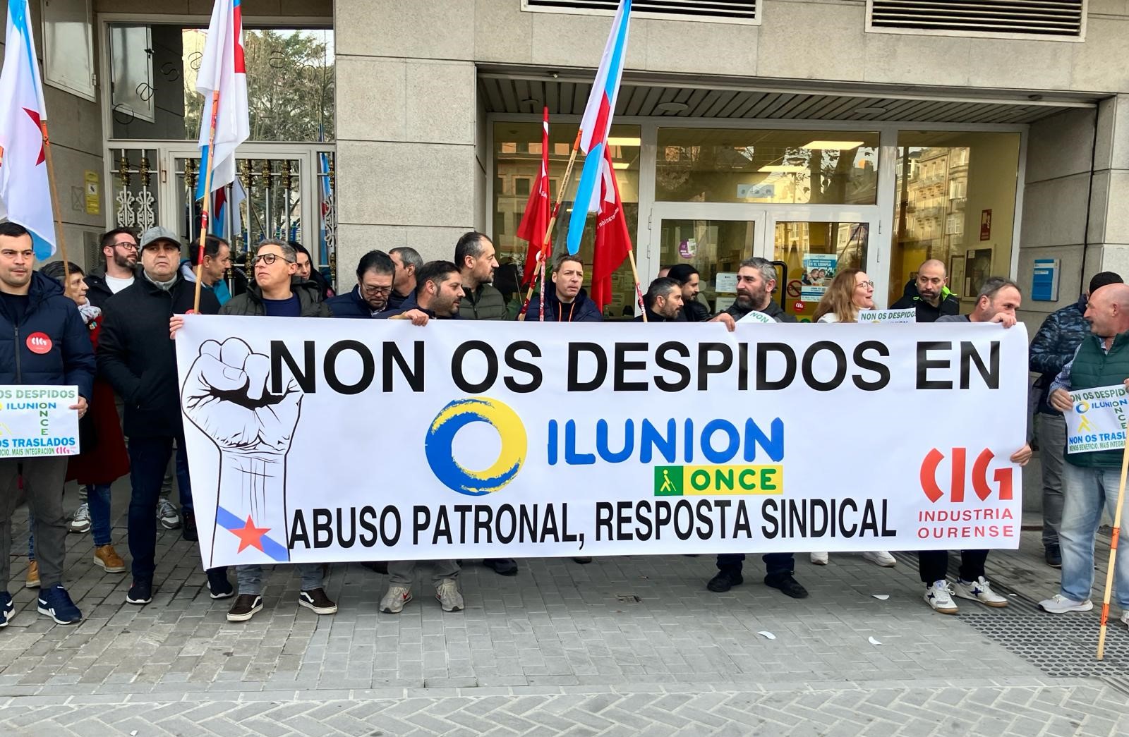 A concentración, na que participaron empregados/as de Ilunion de Vigo, tivo lugar diante da sede ourensá da ONCE de 10:00 a 11:00 horas ao berro de “Despedidos readmisión” e “Abuso patronal, resposta sindical” para rexeitar a decisión de Ilunion de rescindirlle o contrato a parte do persoal que desenvolvía o seu labor na empresa de automoción Faurecia.