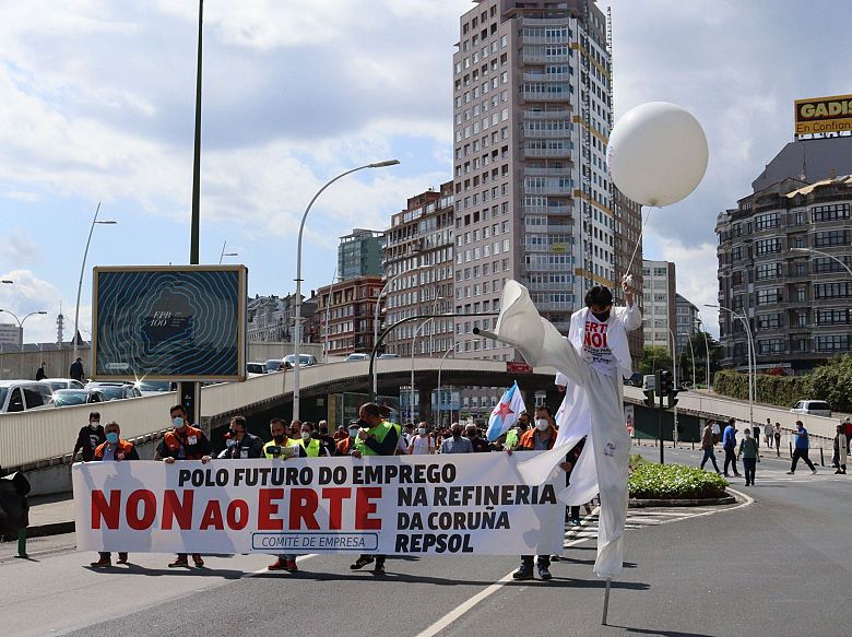 Dentro do calendario de mobilizacións acordado, os traballadores e as traballadoras da refinería da Coruña manifestáronse este sábado dende a Praza da Palloza até o Pazo de María Pita para esixir a Repsol a retirada do ERTE e que execute os investimentos necesarios para adaptar as instalacións ao proceso de transición enerxética e garantir así a viabilidade produtiva e dos empregos.