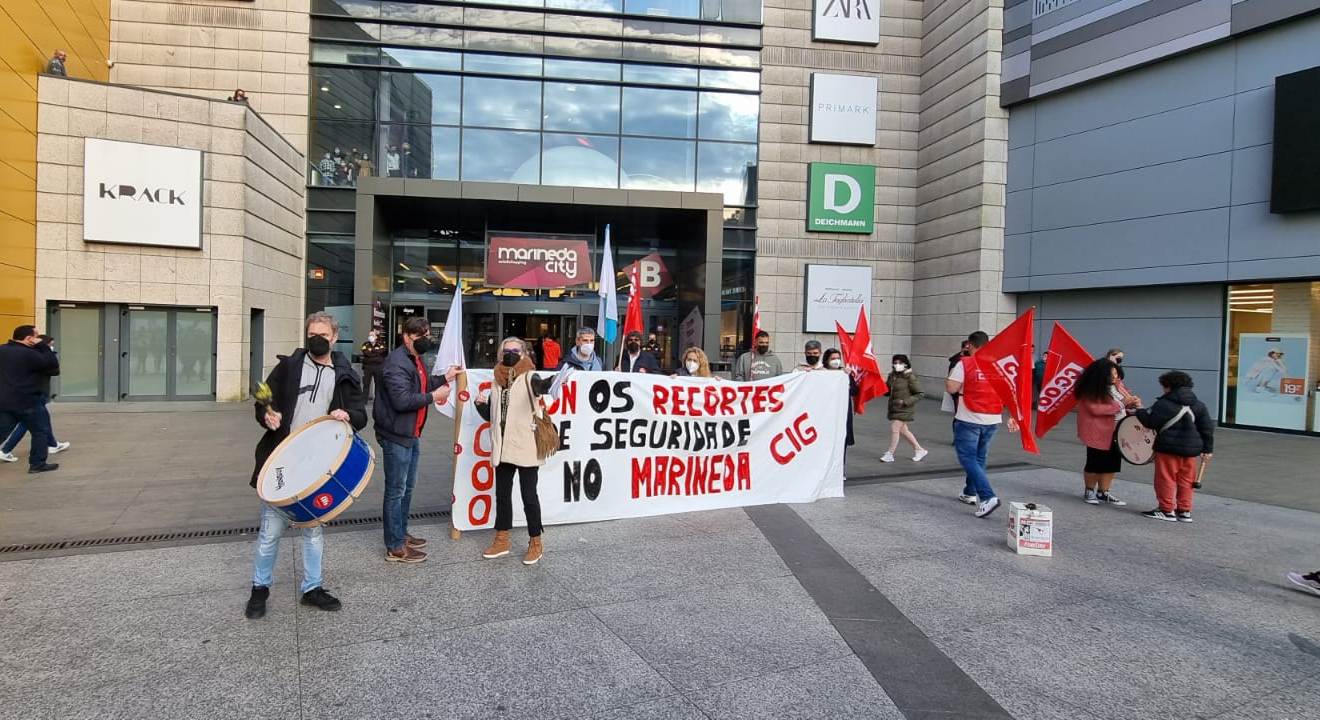 Traballadores e traballadoras da seguridade privada do Centro Comercial Marineda City concentráronse o pasado sábado para denunciar os recortes que a dirección do complexo comercial leva anos aplicando no servizo de vixilancia. Na concentración, convocada pola CIG e CCOO, advertiuse que os recortes non só afectan ao persoal de seguridade, senón tamén ao persoal auxiliar, nun intento de maximizar beneficios a conta de destruír emprego e sobrecargar de traballo.