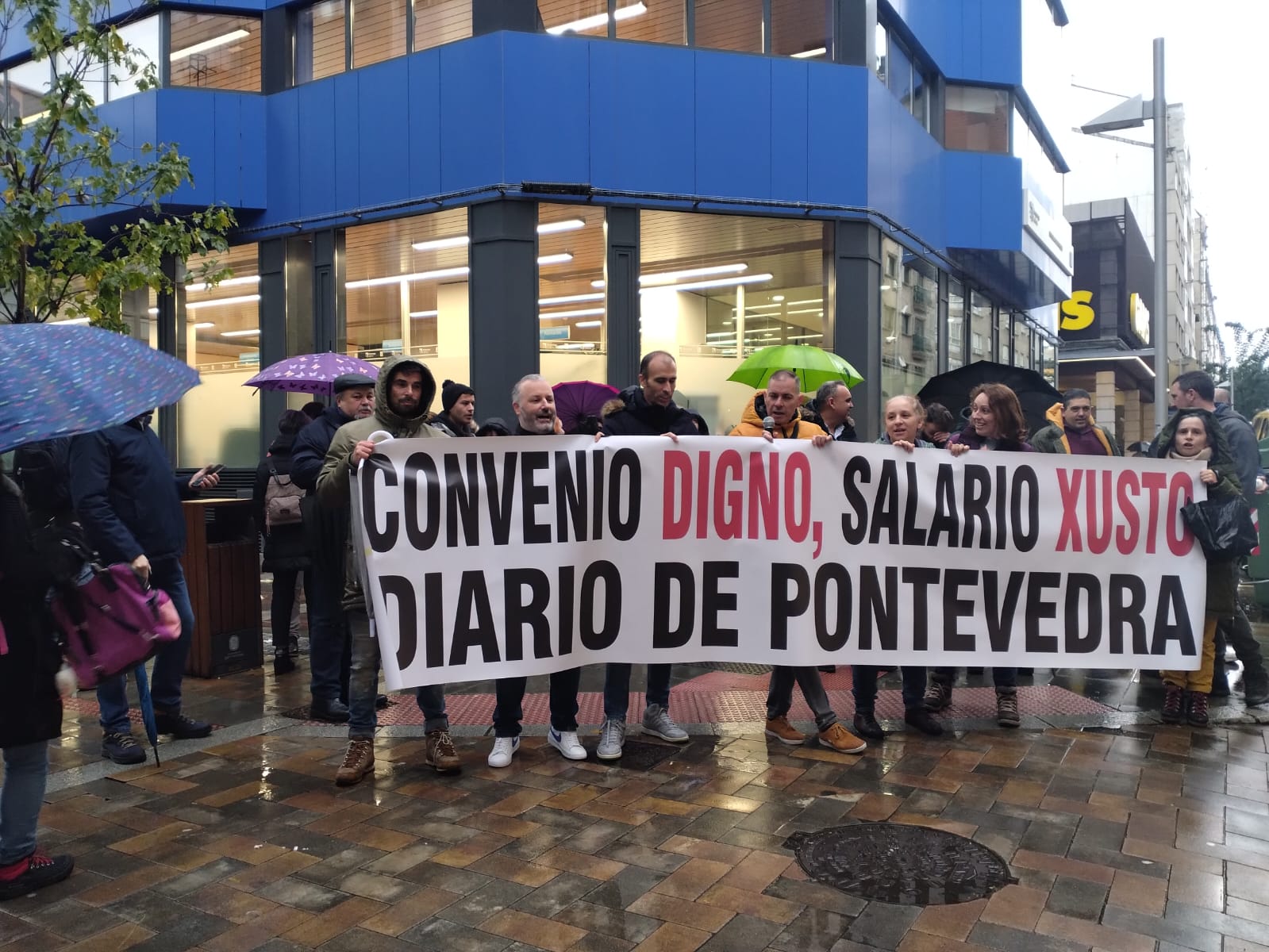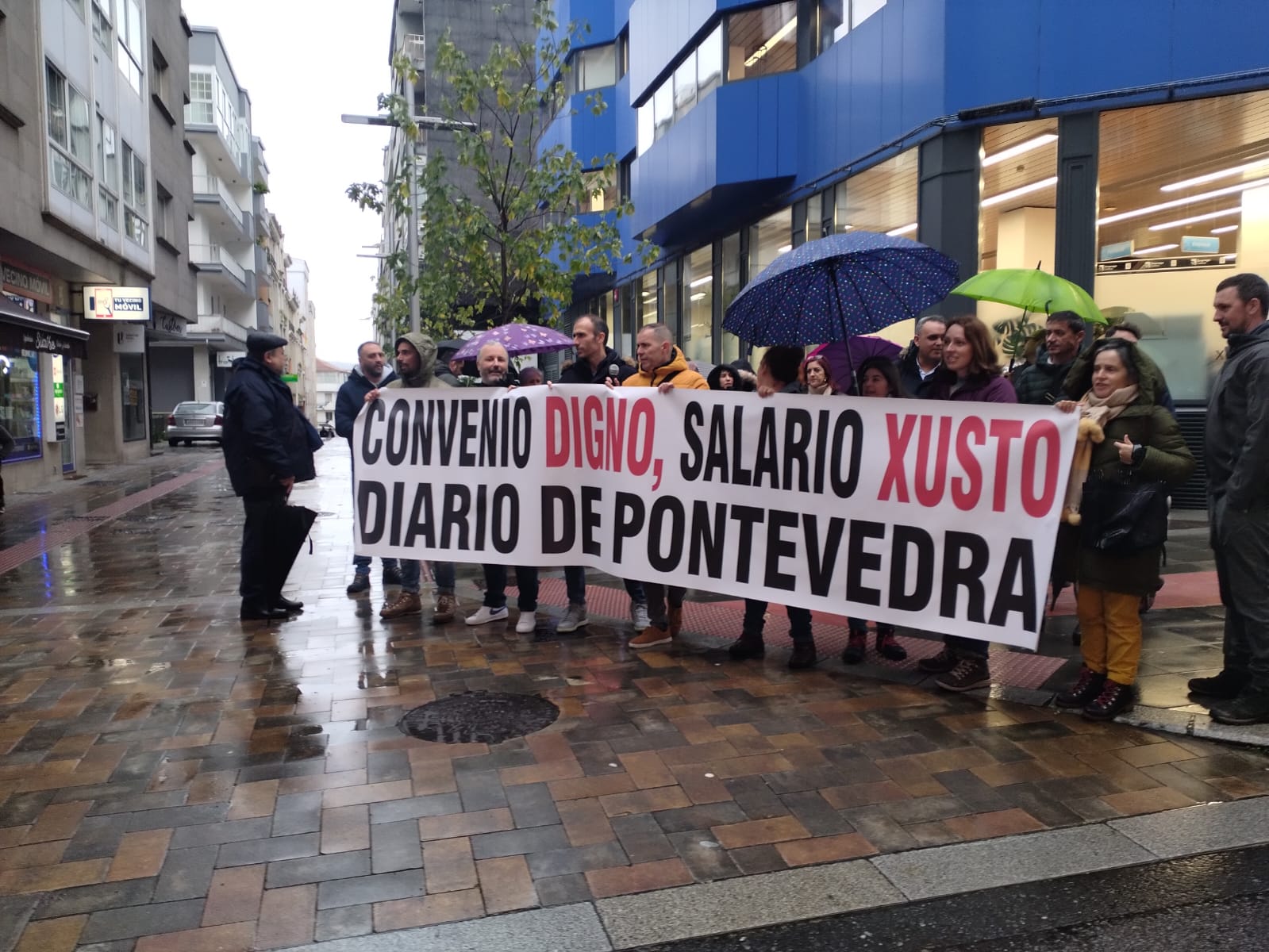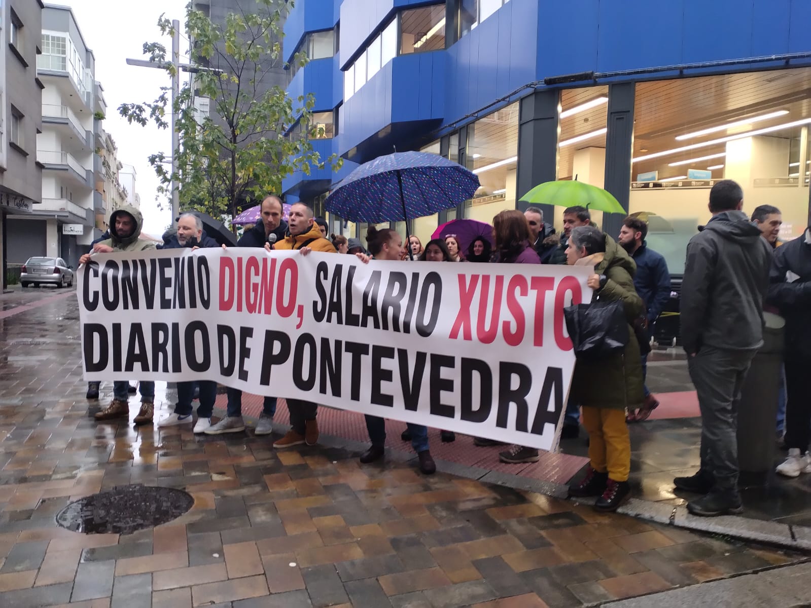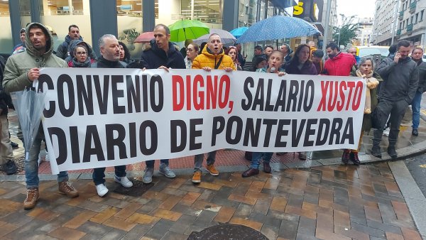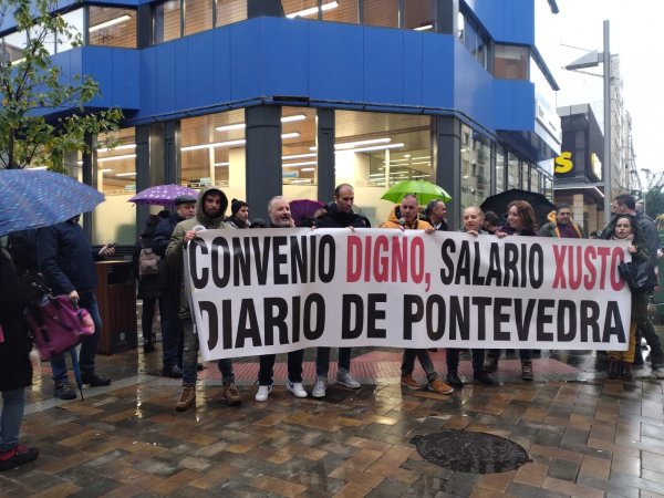 A concentración celebrouse de 11:00 a 12:00 horas no entronque das rúas Lepanto e Benito Corbal ao berro de “Convenio digno, salarios xustos” e “Pontevedra, escoita, o Diario está en loita”. Tanto o paro como as mobilizacións contan co apoio da CIG e da UGT, os dous sindicatos con representación no Diario de Pontevedra, cabeceira que fai parte do grupo El Progreso.