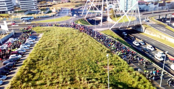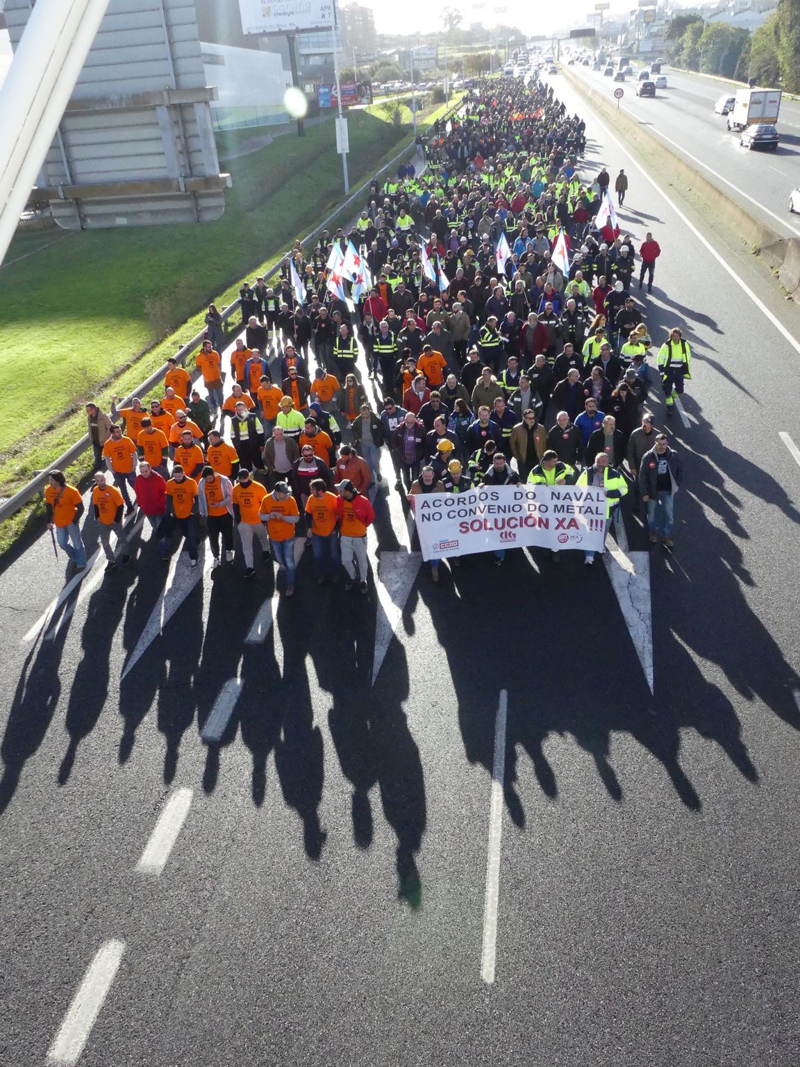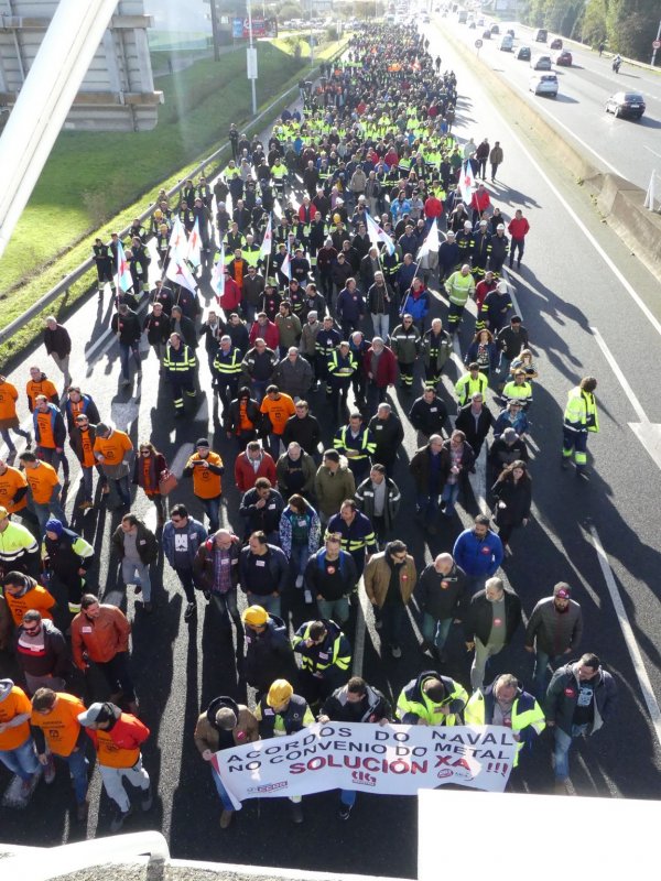 Miles de traballadores e as traballadoras da industria auxiliar de Navantia, xunto con persoal propio da empresa naval, marcharon este mércores polas rúas da Coruña para esixir a incorporación dos acordos salariais das auxiliares no convenio colectivo provincial do metal. A manifestación, que contou co apoio dun grupo de traballadores de Alcoa, saía pasadas as dez da mañá da explanada do edificio de sindicatos, percorreu un tramo da Avenida Alfonso Molina, e continuou pola zona das Paxariñas até rematar diante da sede da Confederación de Empresarios da Coruña, na Praza Luís Seoane.